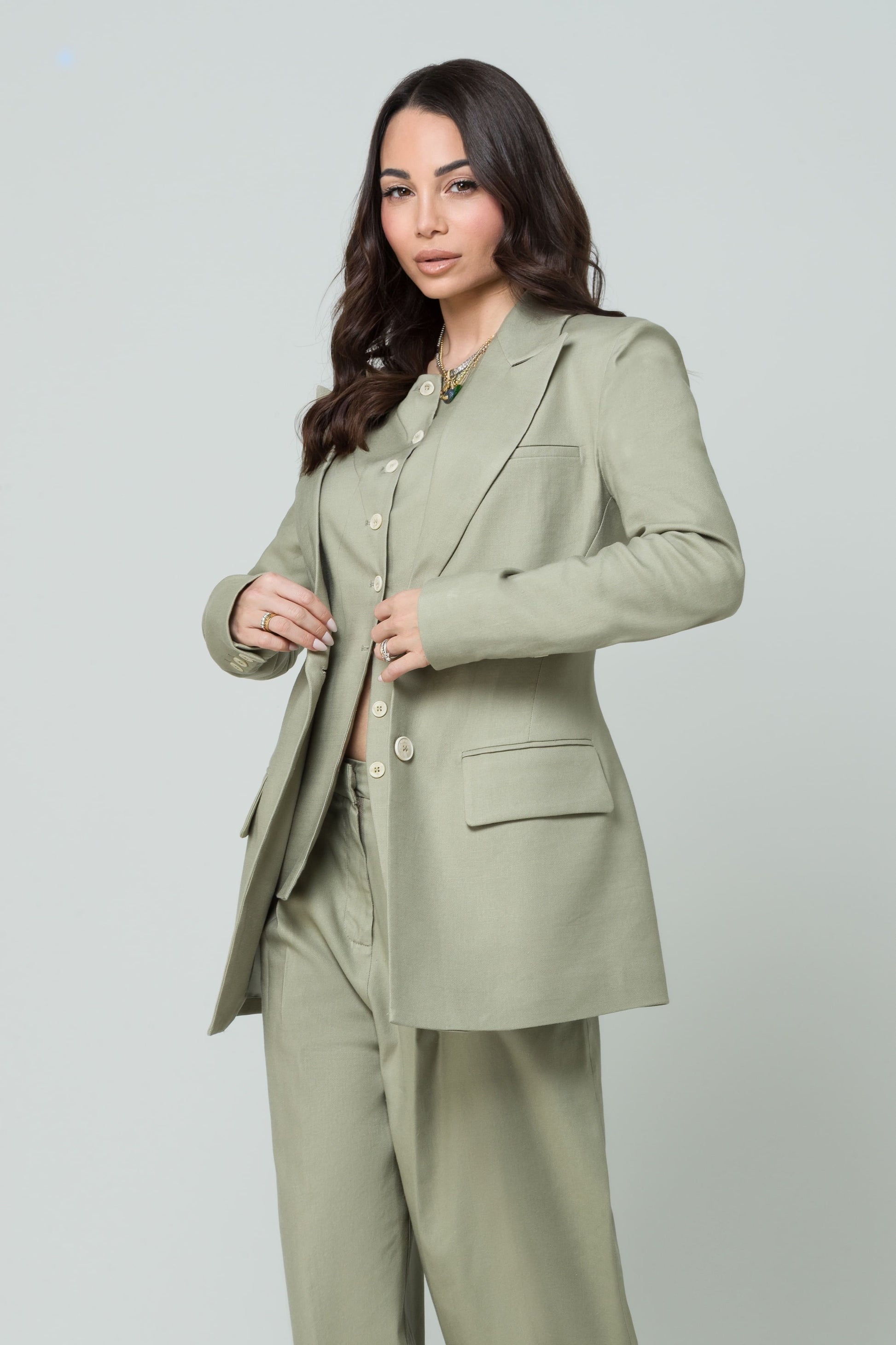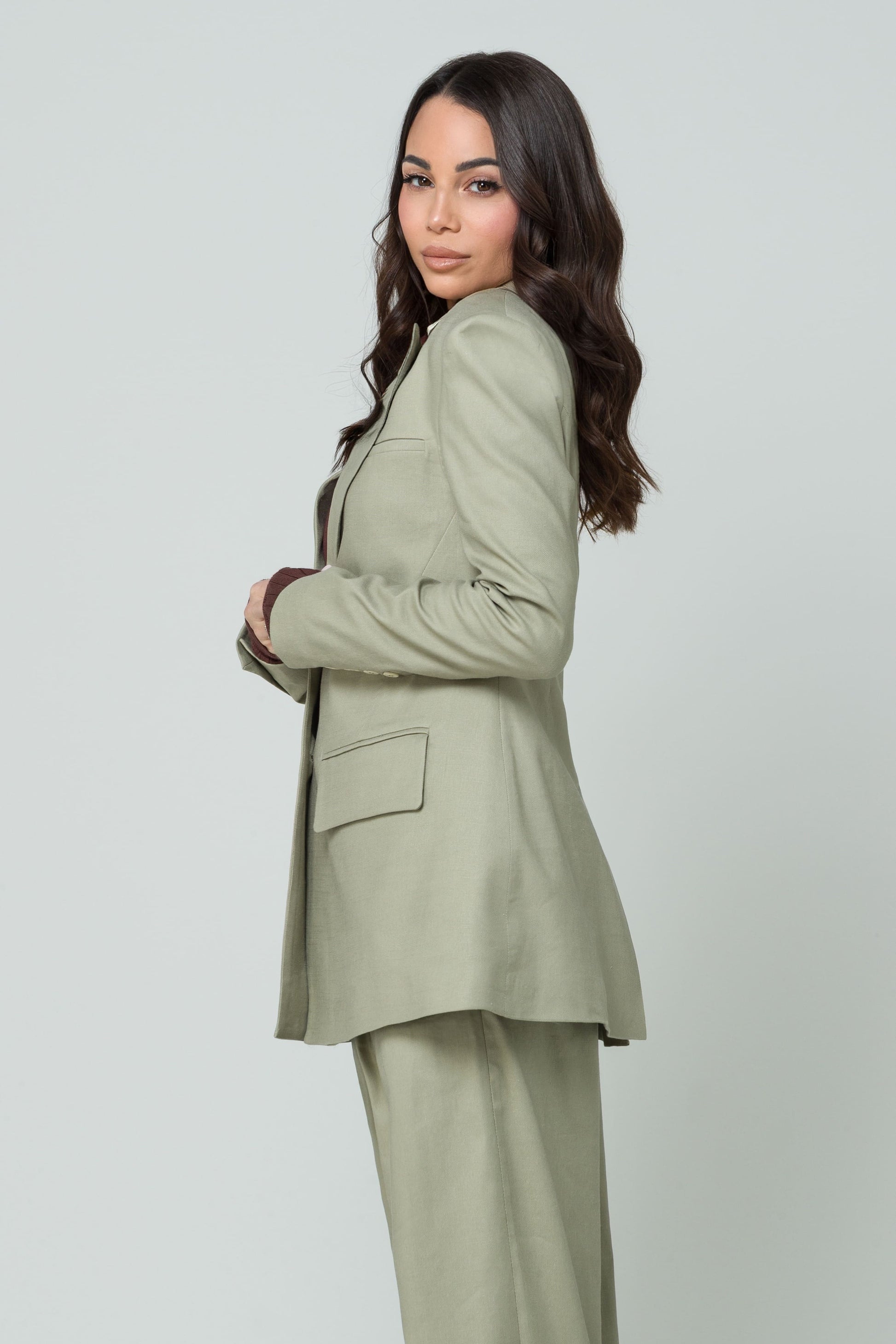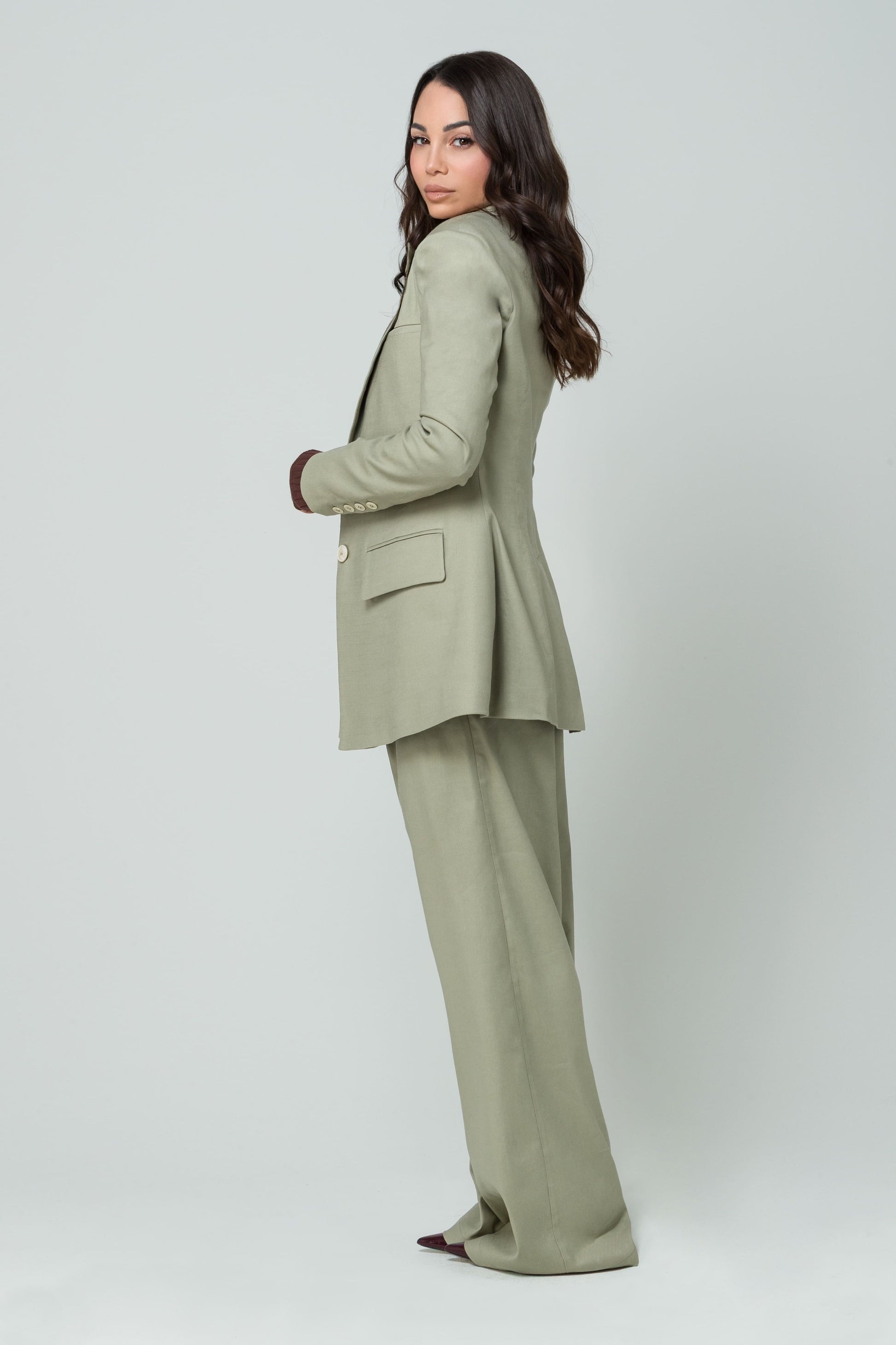 Blazer monopetto in lino dalla linea sfiancata, con spalle strutturate imbottite, rever classici e chiusura con doppio bottone. Dettagli sartoriali come le tasche con filetto e patta, maniche con spacco e bottoni, ne esaltano l’eleganza essenziale. Un capo senza tempo, perfetto da solo o in completo.