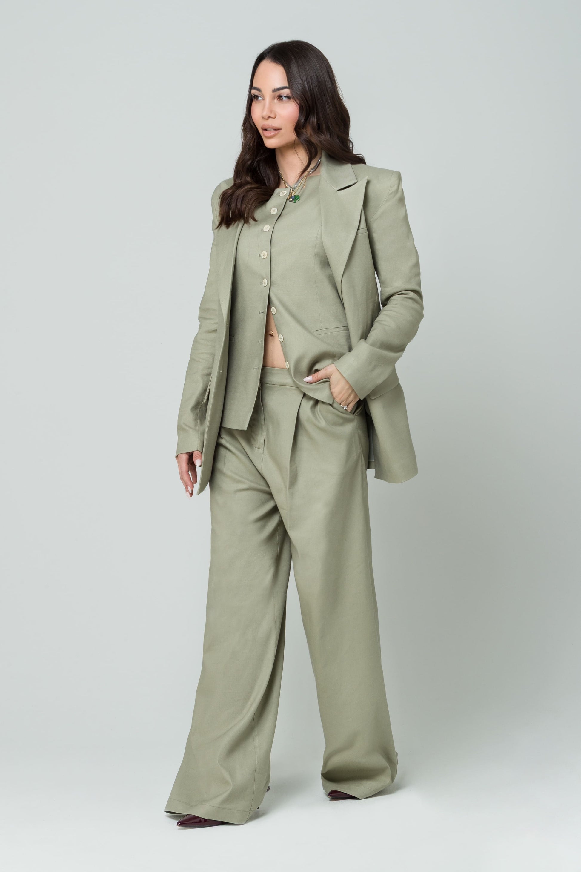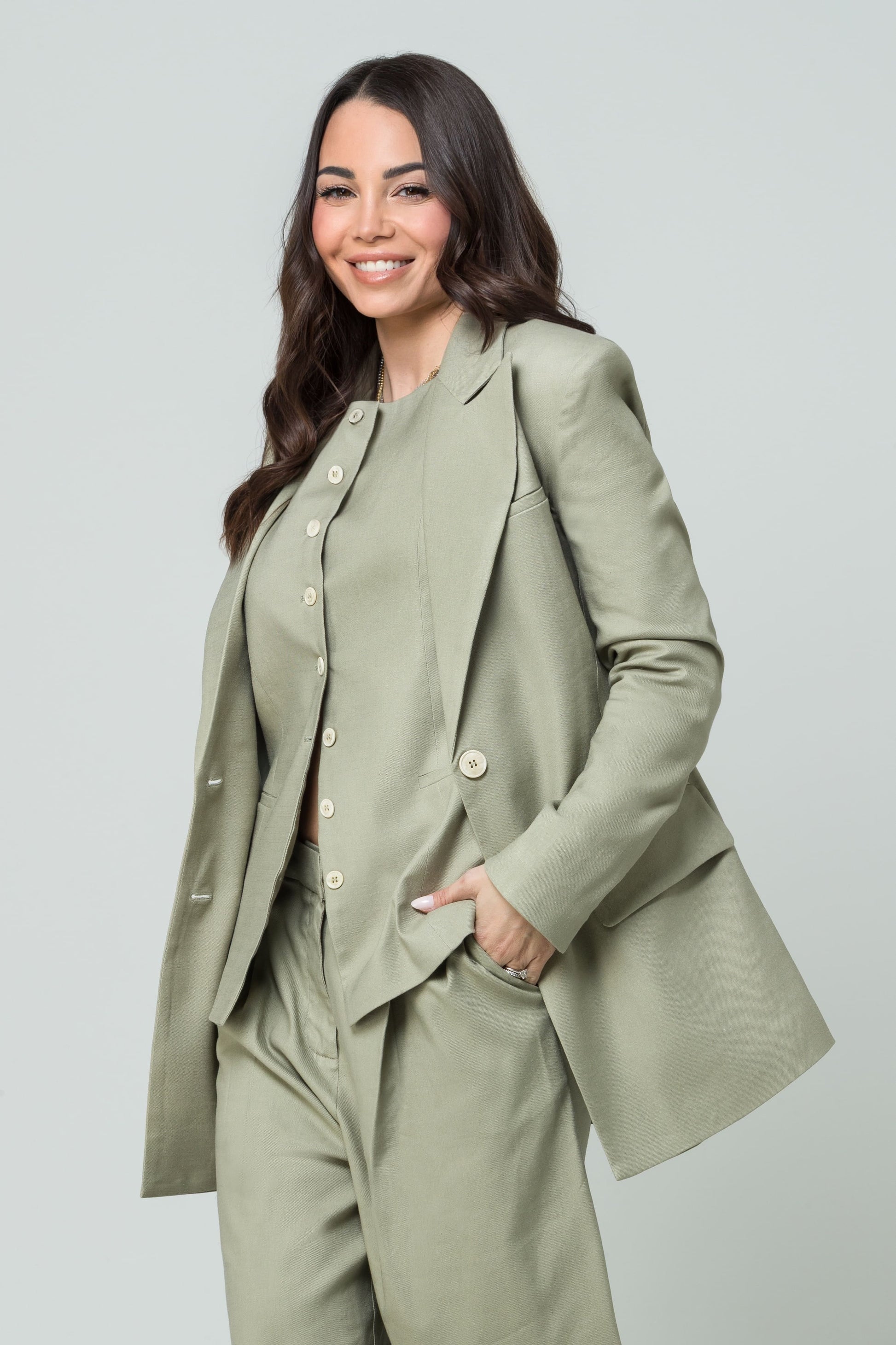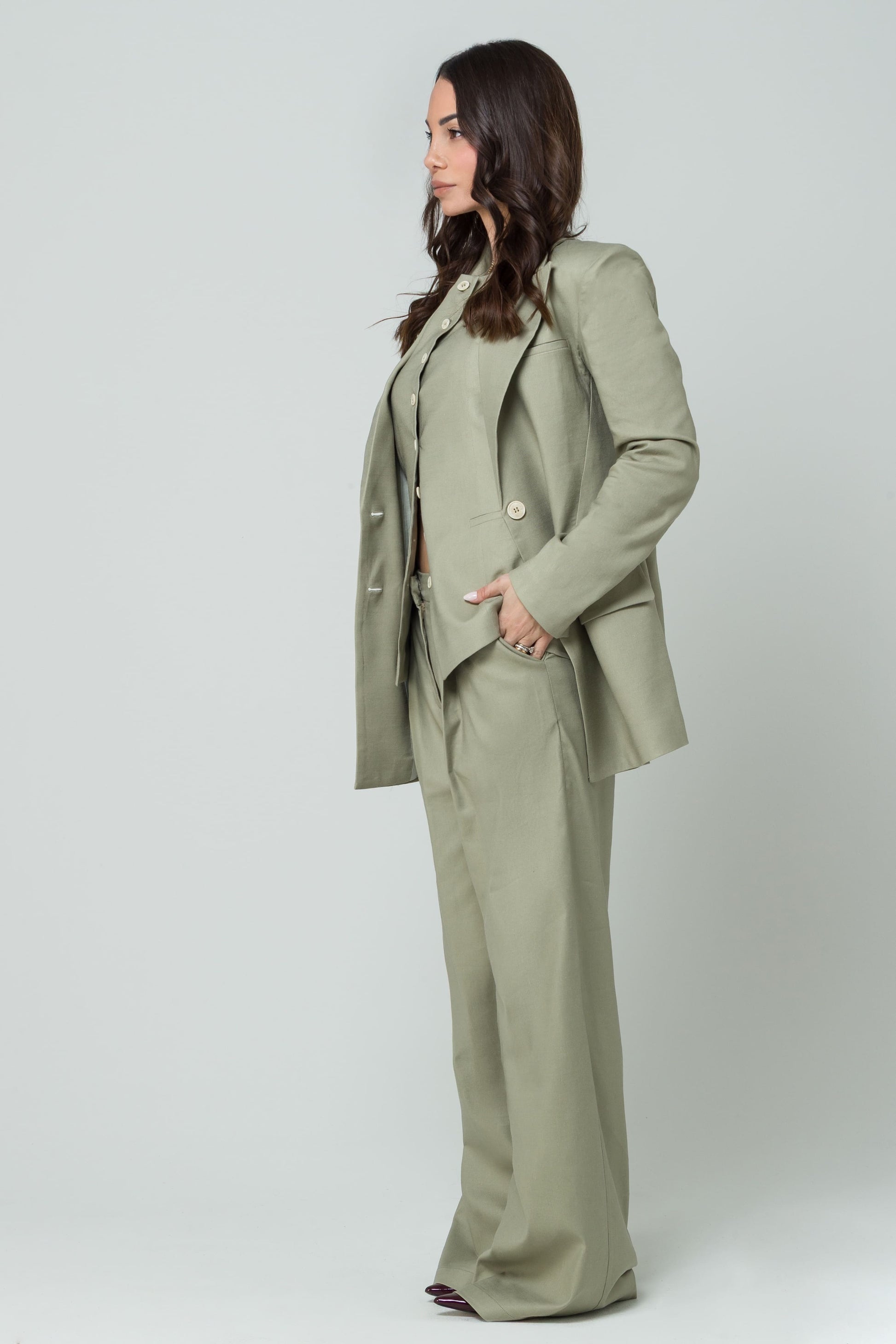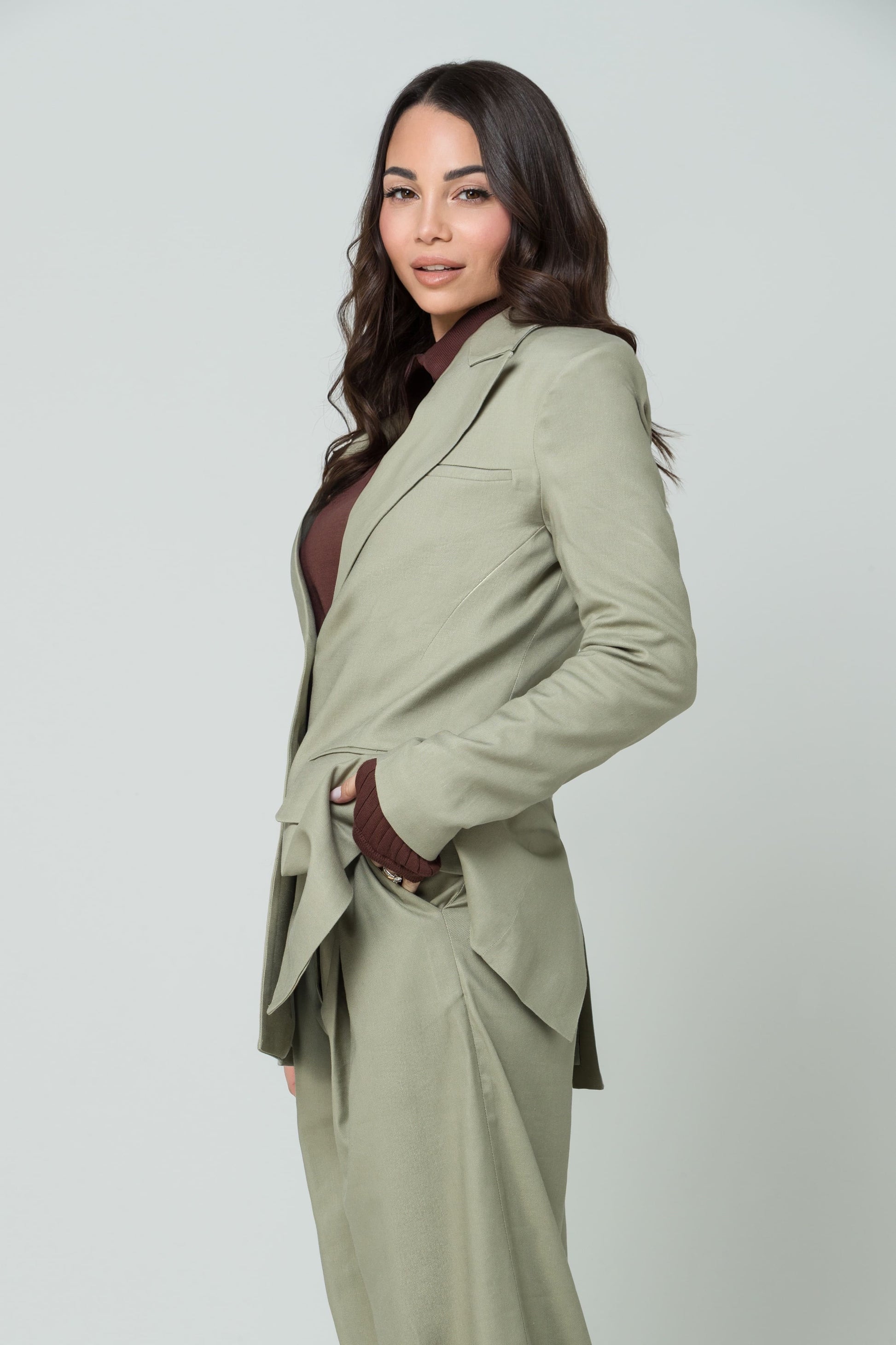 Blazer monopetto in lino dalla linea sfiancata, con spalle strutturate imbottite, rever classici e chiusura con doppio bottone. Dettagli sartoriali come le tasche con filetto e patta, maniche con spacco e bottoni, ne esaltano l’eleganza essenziale. Un capo senza tempo, perfetto da solo o in completo.