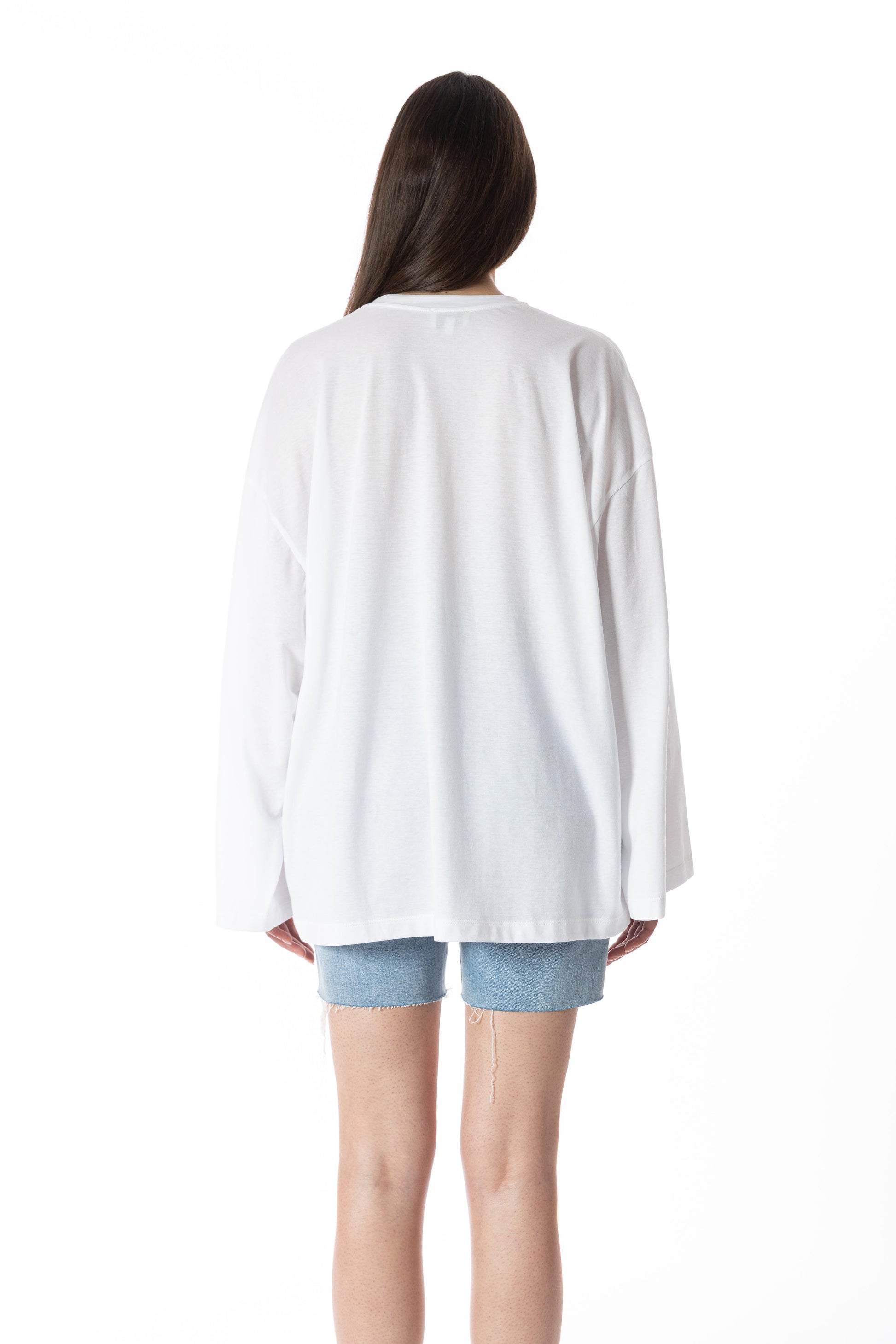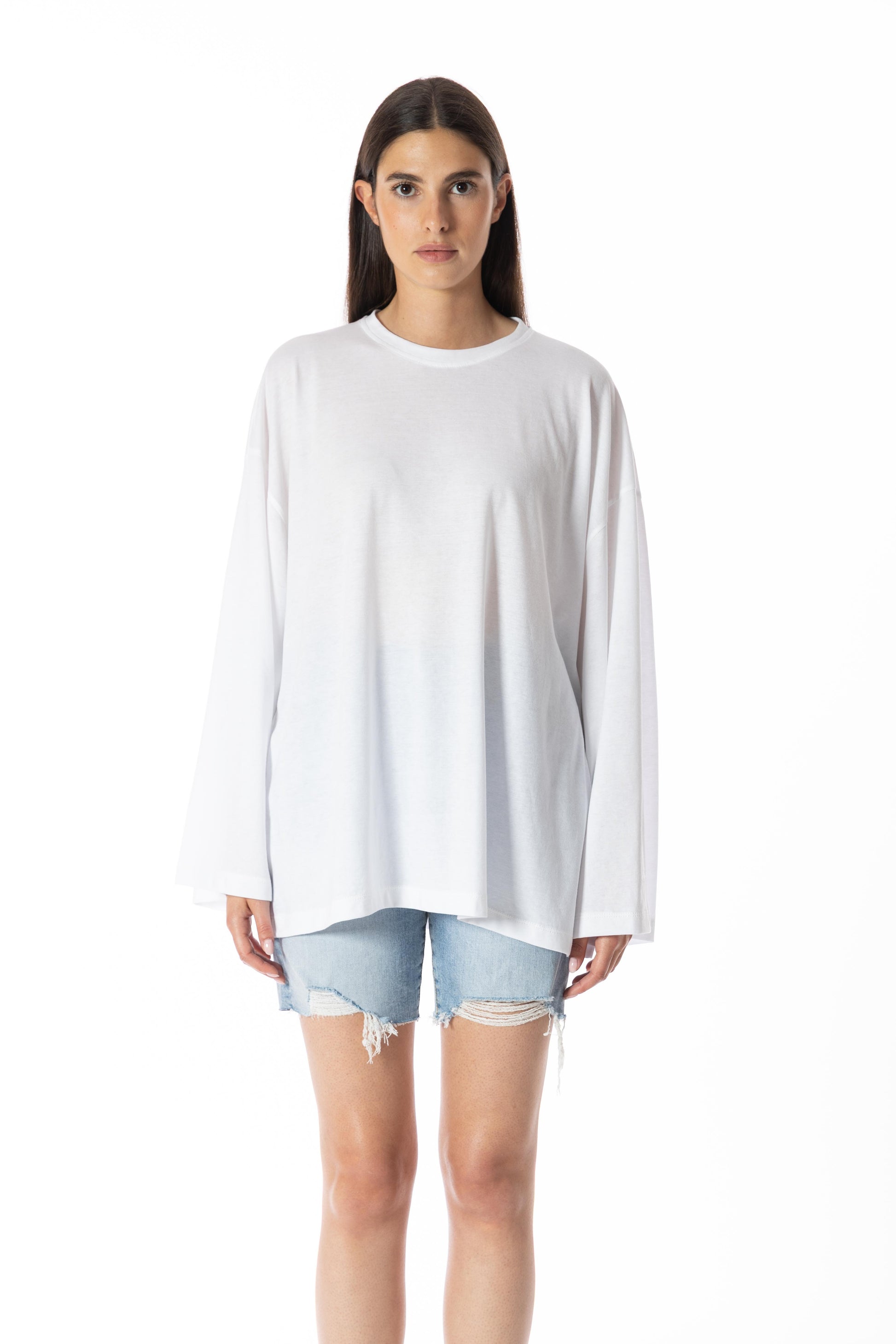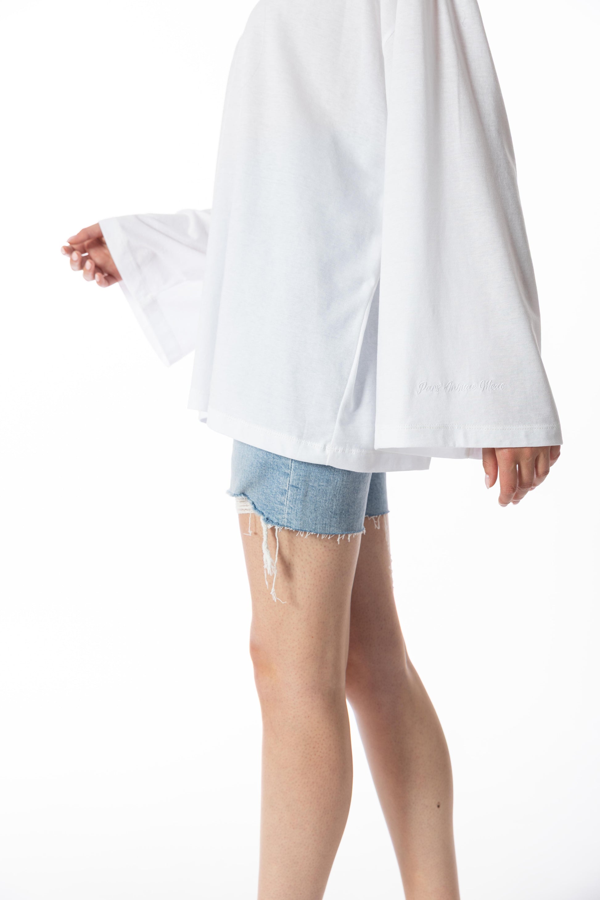 Nacre è una maglia oversize in morbido jersey bianco, caratterizzata da maniche lunghe ampie e un taglio rilassato che dona movimento e comfort. Il dettaglio ricamato “Pars Animae Meae” sulla manica sinistra aggiunge un tocco distintivo e raffinato. Perfetta da indossare da sola o sopra abiti leggeri in pizzo, per un look casual-chic dallo spirito libero.
