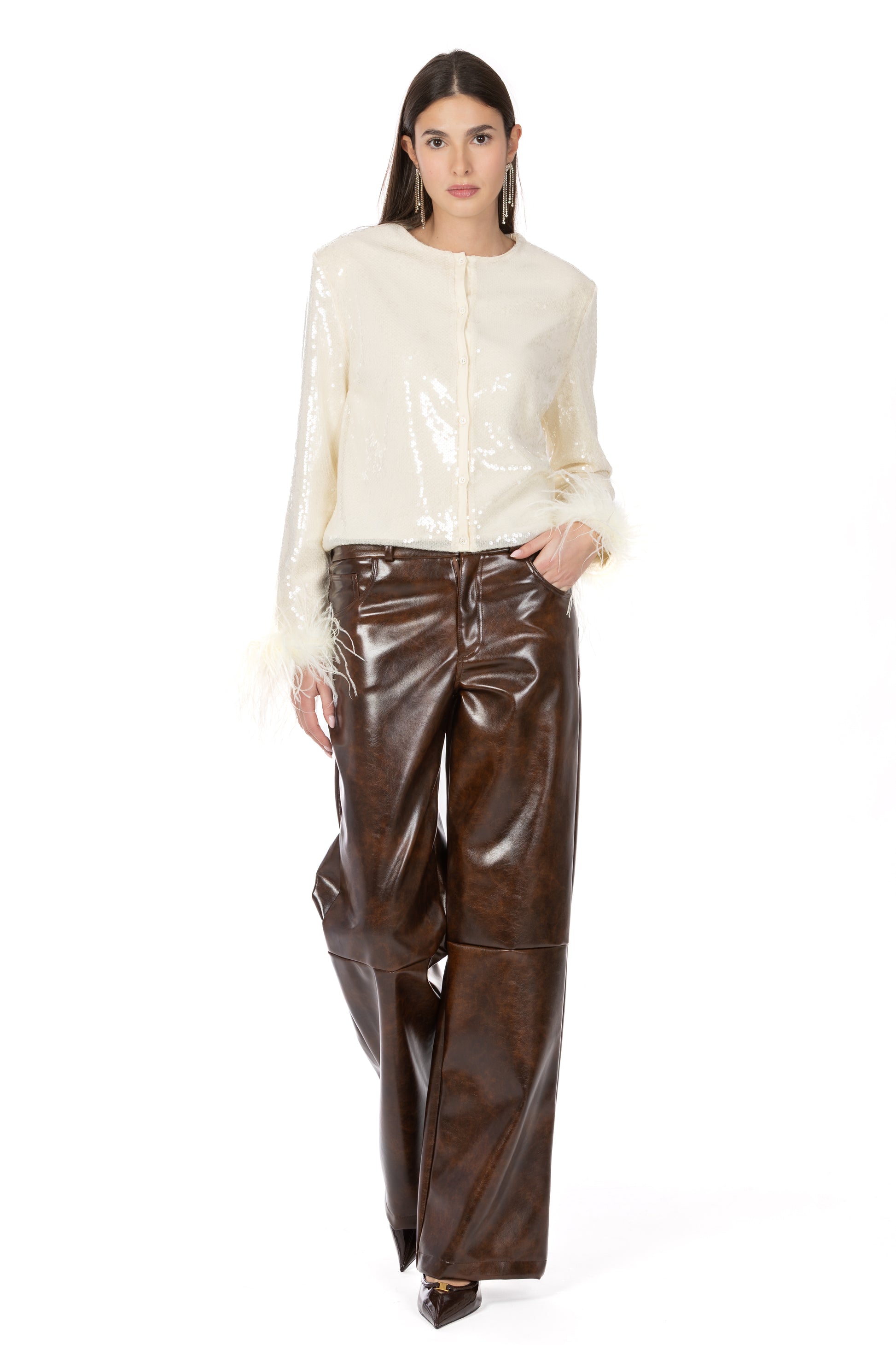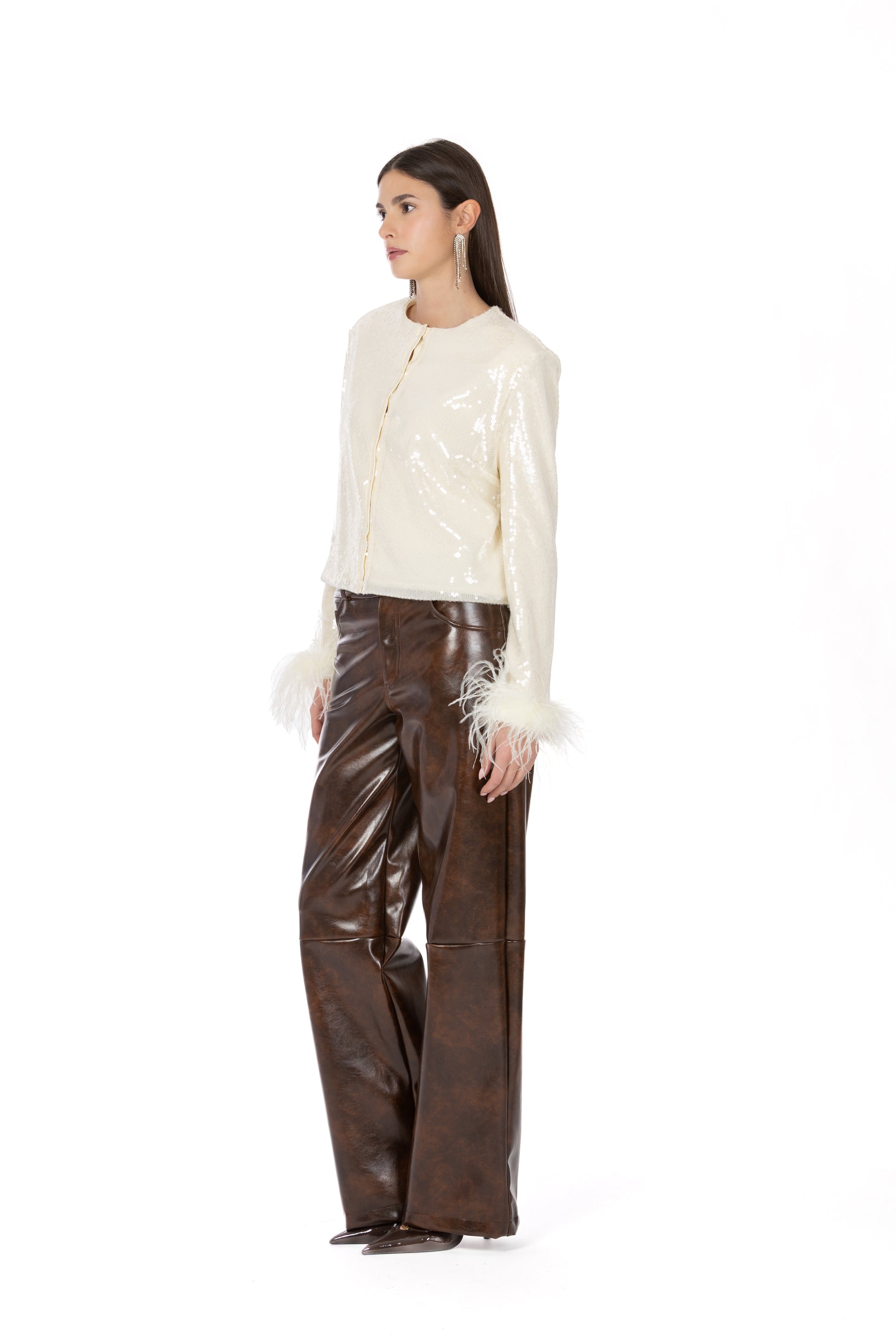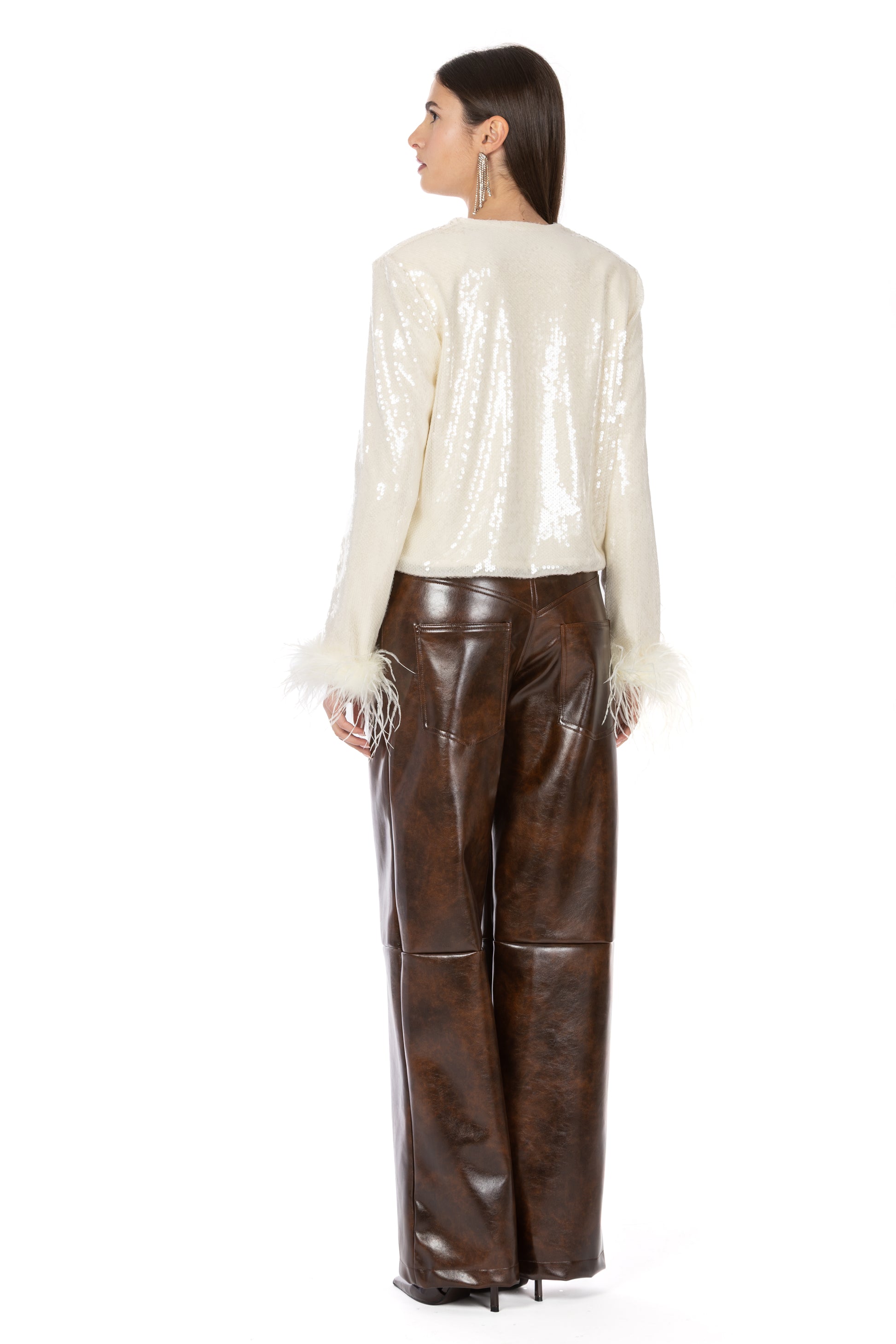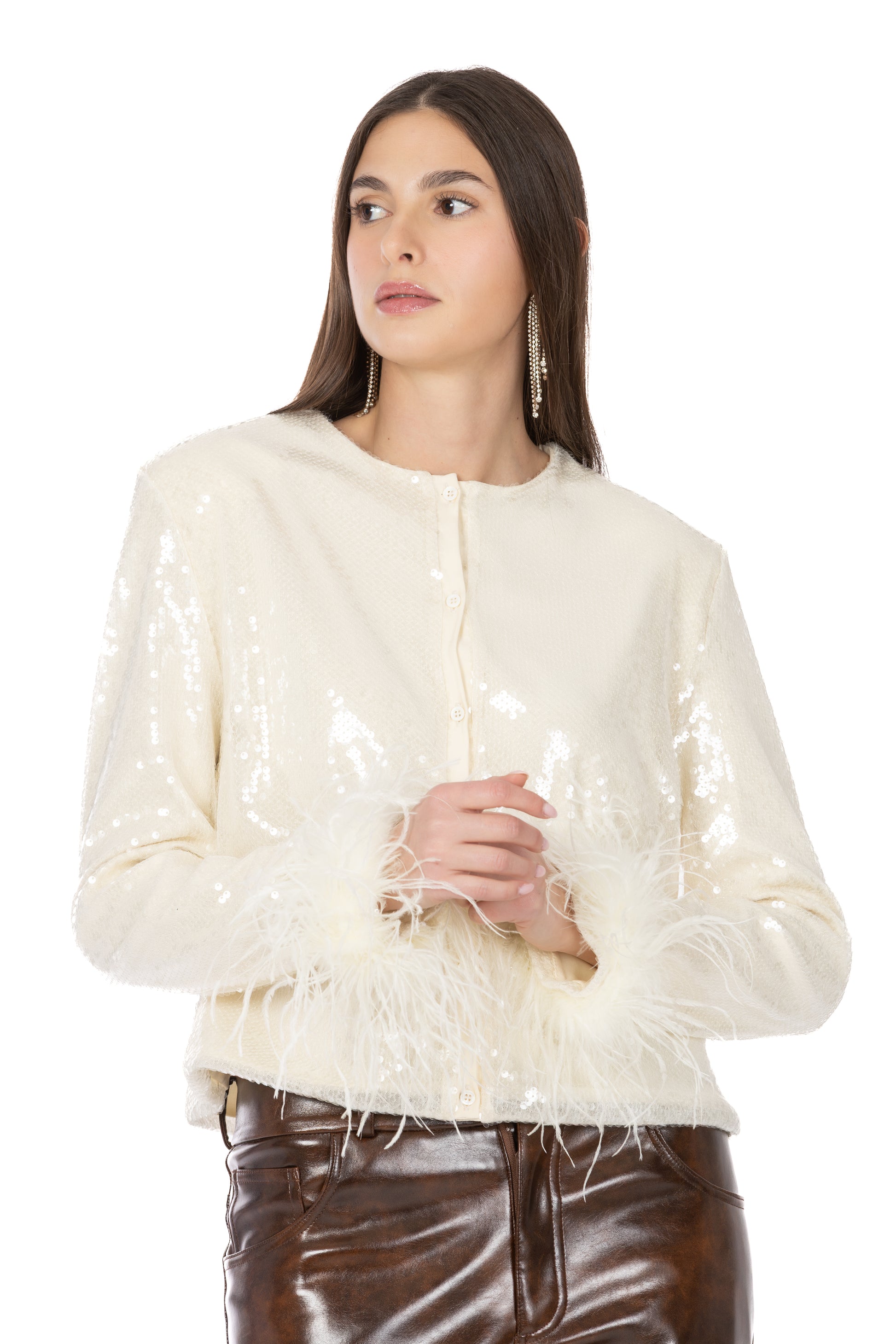 Il design cropped valorizza la figura, mentre le maniche ampie e i polsi decorati con piume aggiungono un dettaglio couture dall’allure sofisticata. La chiusura frontale con bottoni e le spalline leggermente strutturate definiscono la silhouette, rendendo il capo perfetto per completare look da sera o per elevare outfit più quotidiani.