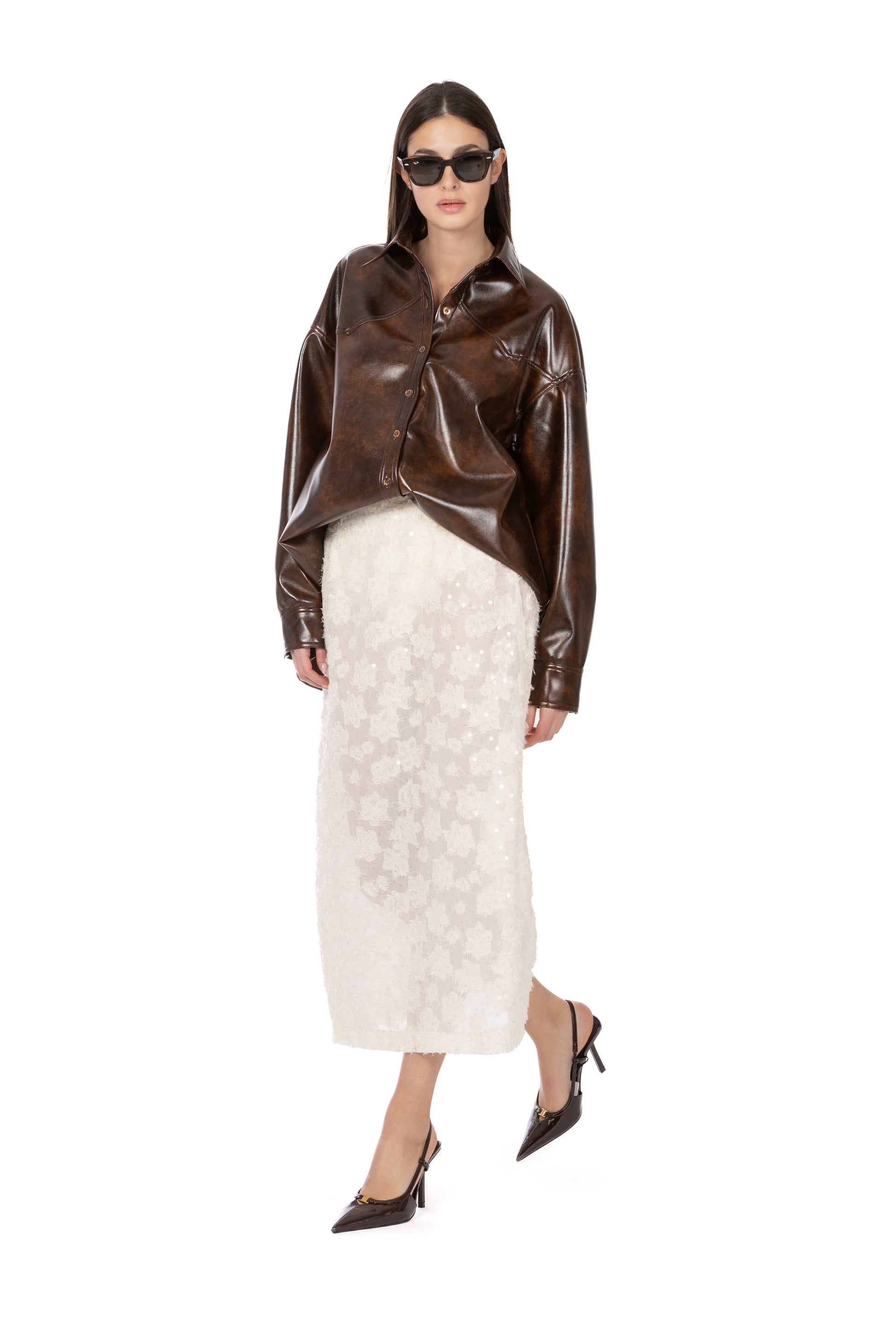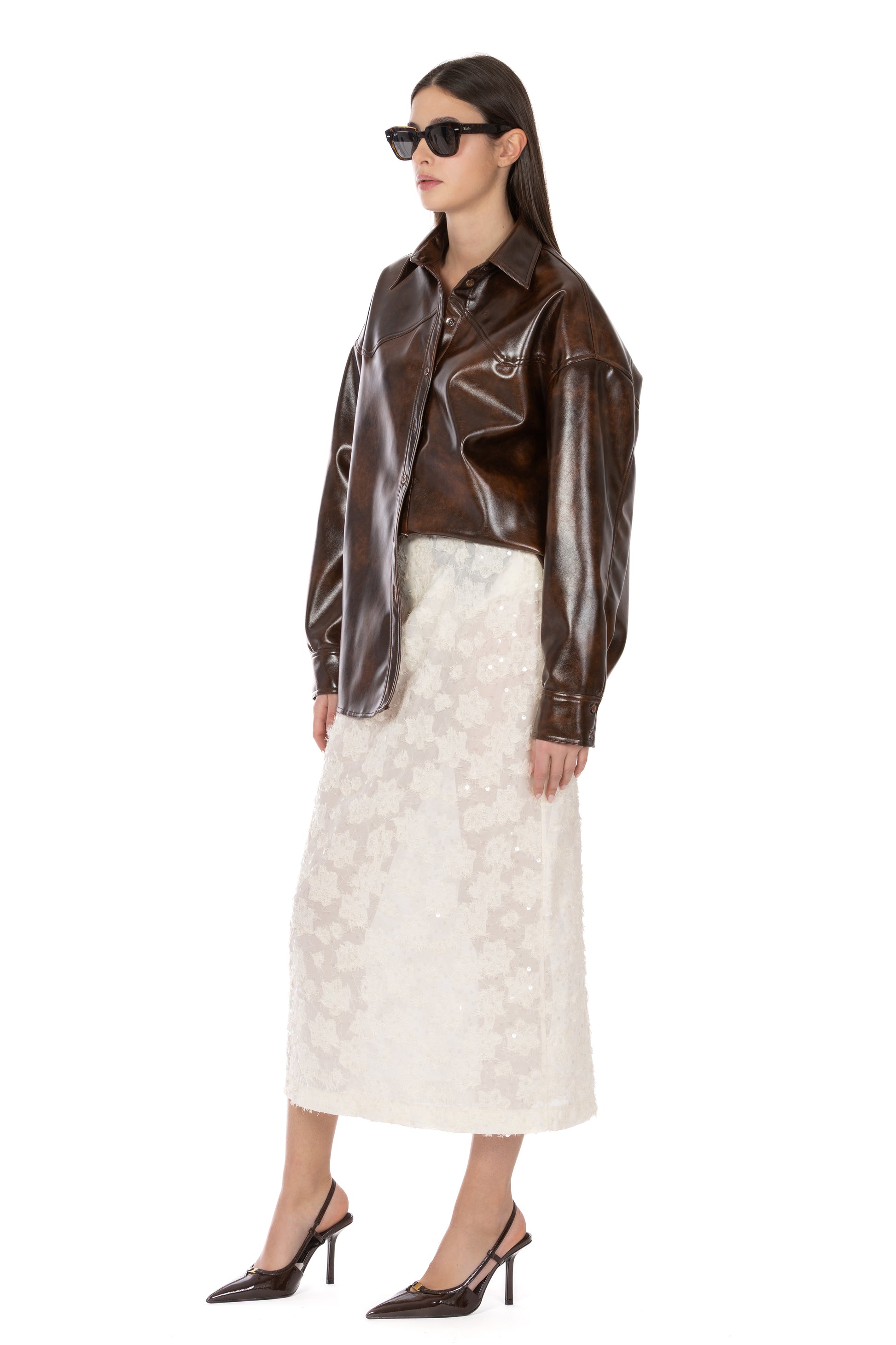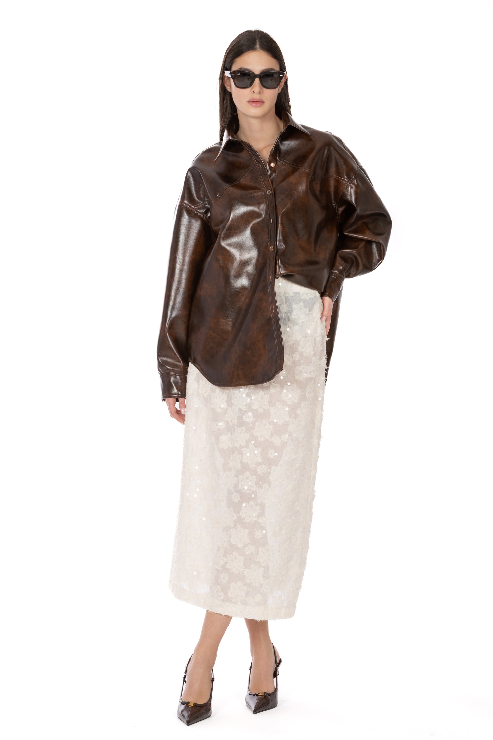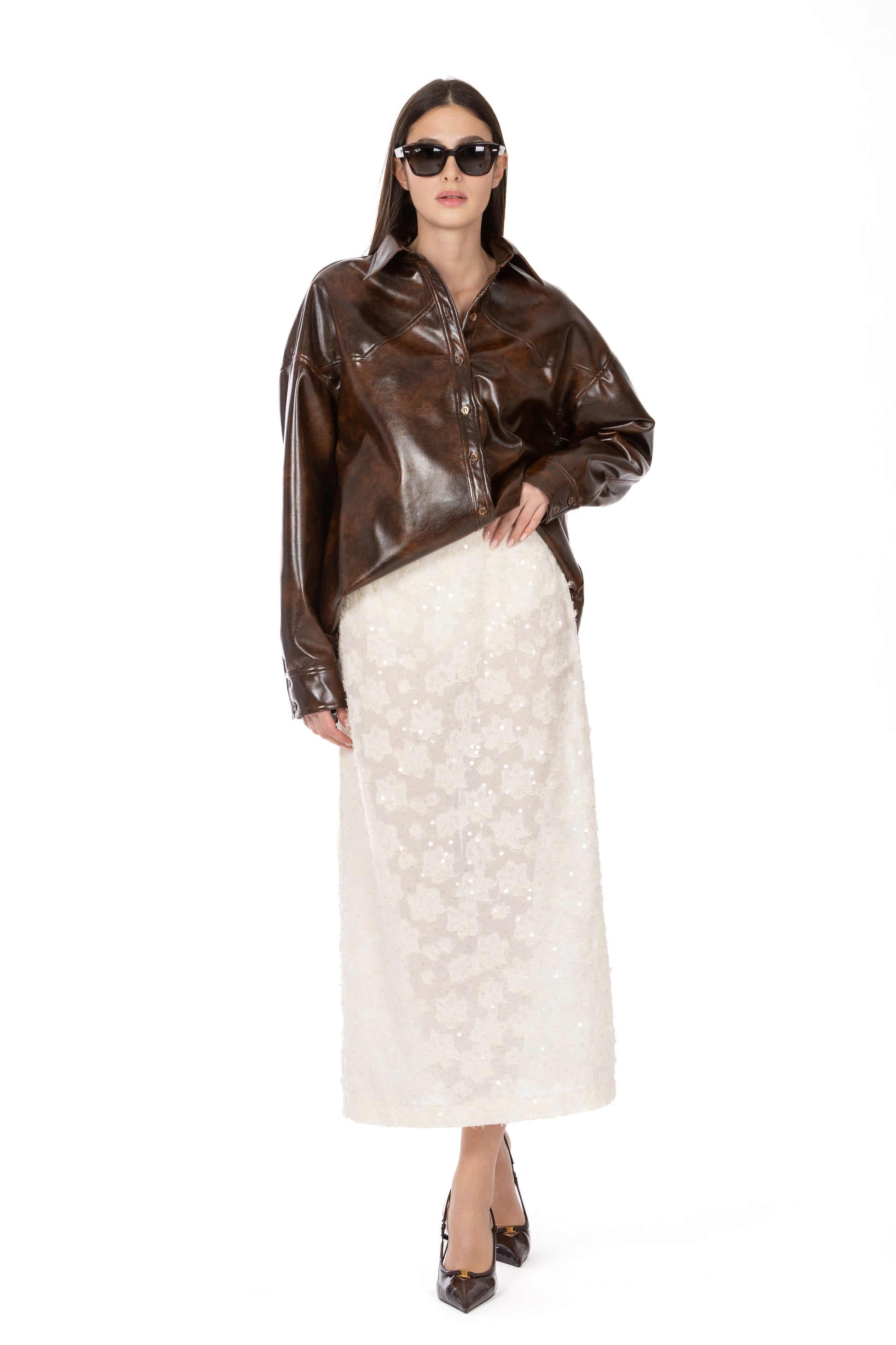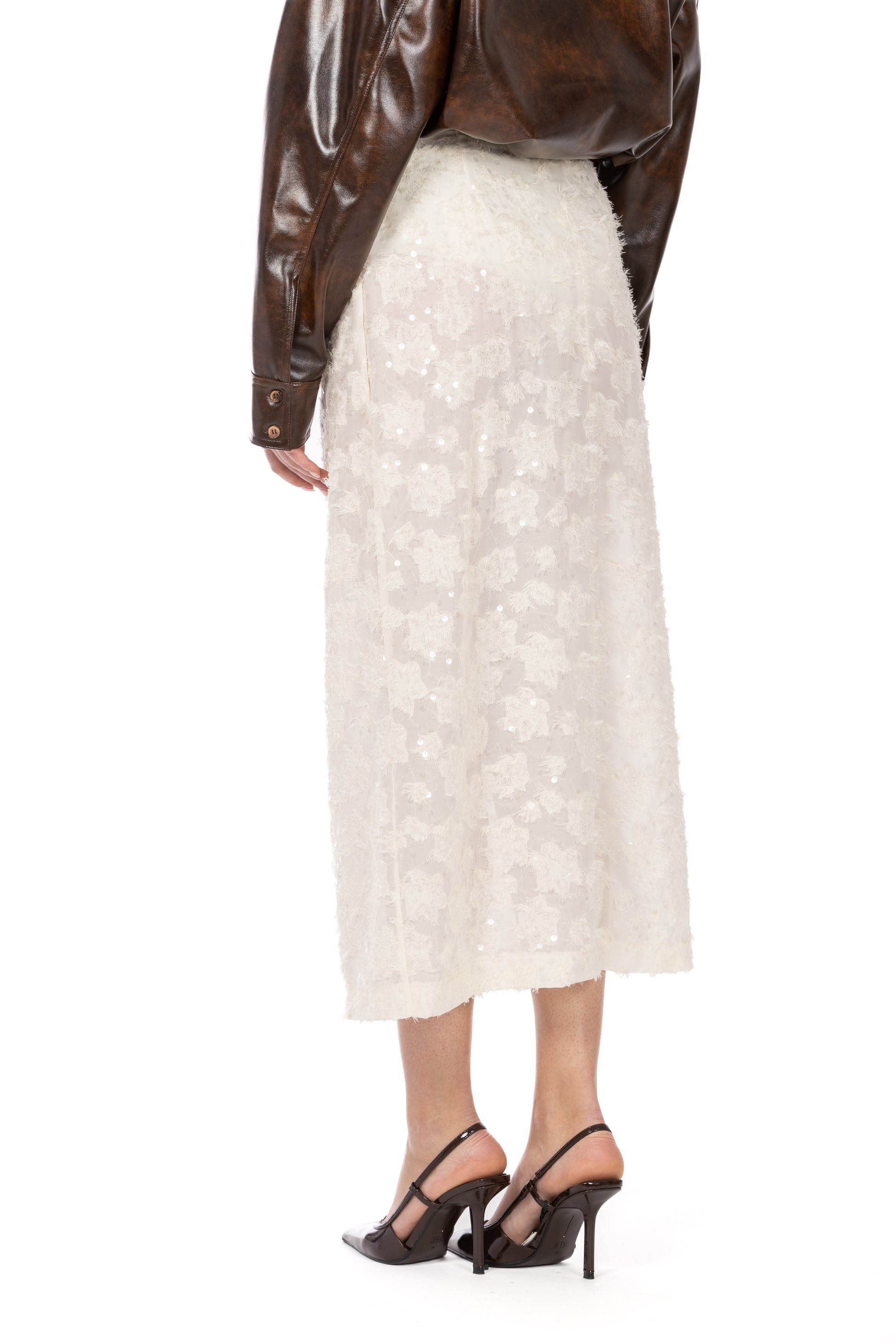 La gonna longuette Lysa esprime tutta la delicatezza e la luce del fil coupé, reinterpretando la tradizione delle paillettes in chiave moderna e sofisticata. Realizzata in voile semitrasparente, scivola morbida lungo la silhouette creando un effetto etereo ma strutturato, perfetto per chi ama capi che uniscono eleganza e carattere.