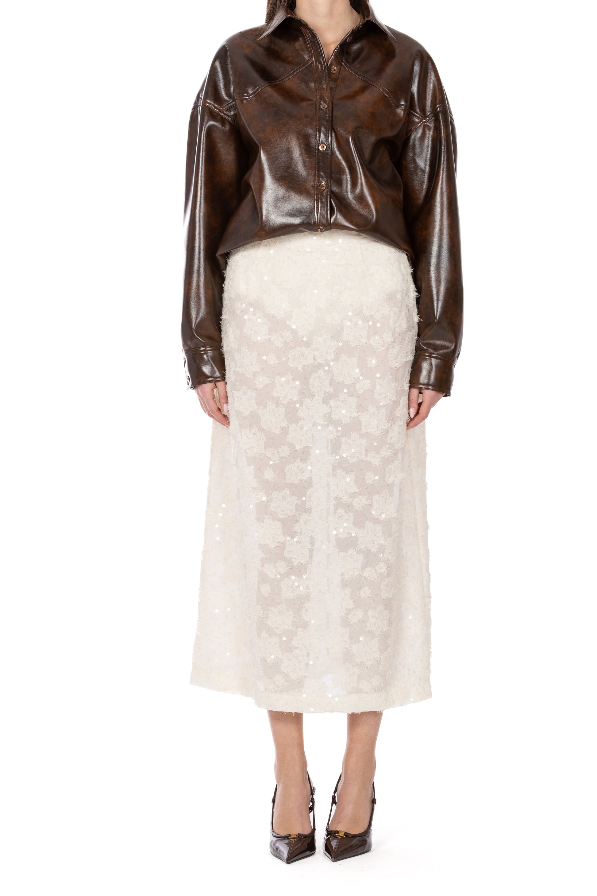 Gonna longuette in voile fil coupé e paillettes, luminosa e fluida. Elegante e versatile, ideale per look da festa o layering invernali. Include coulotte in costina ricamata.
