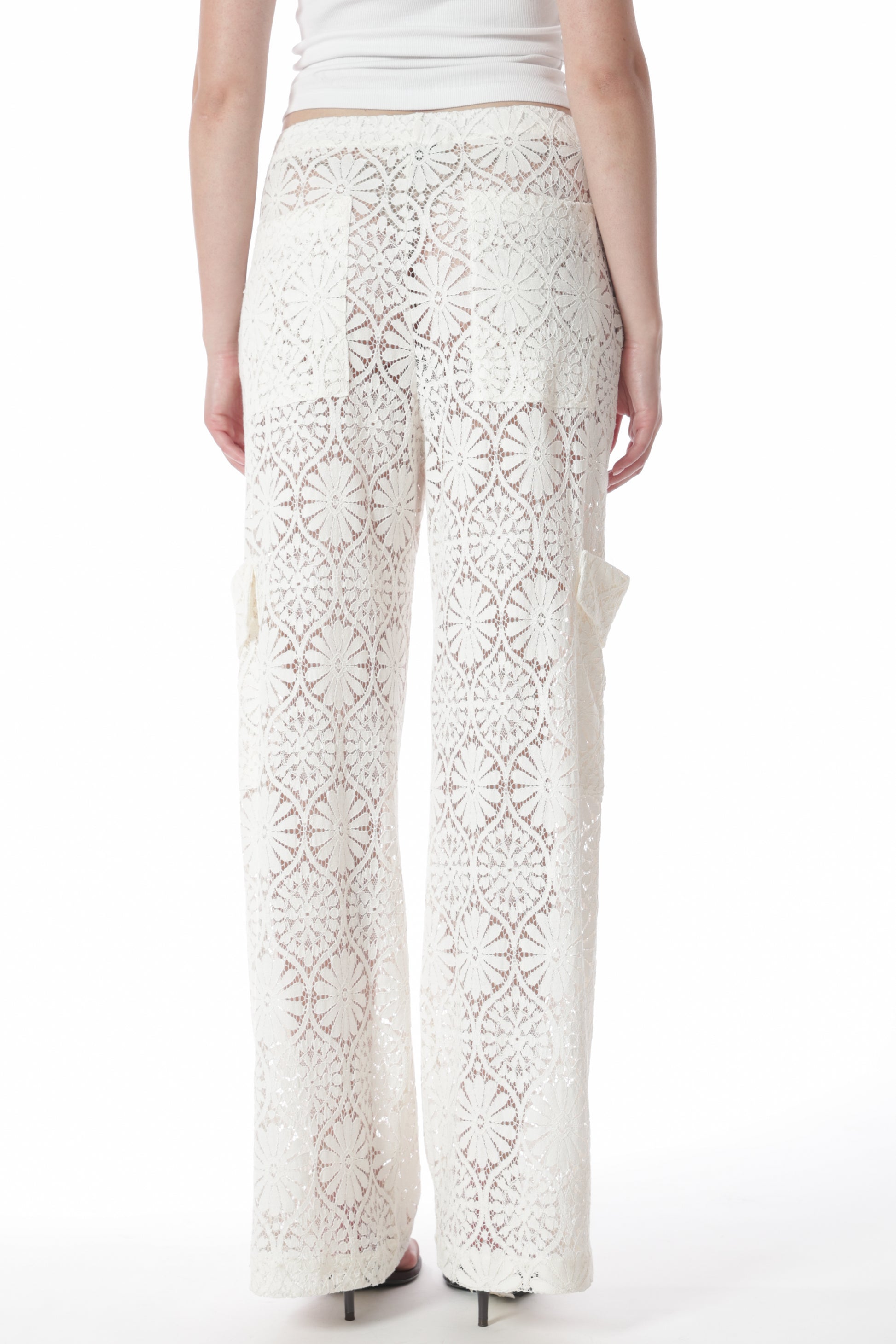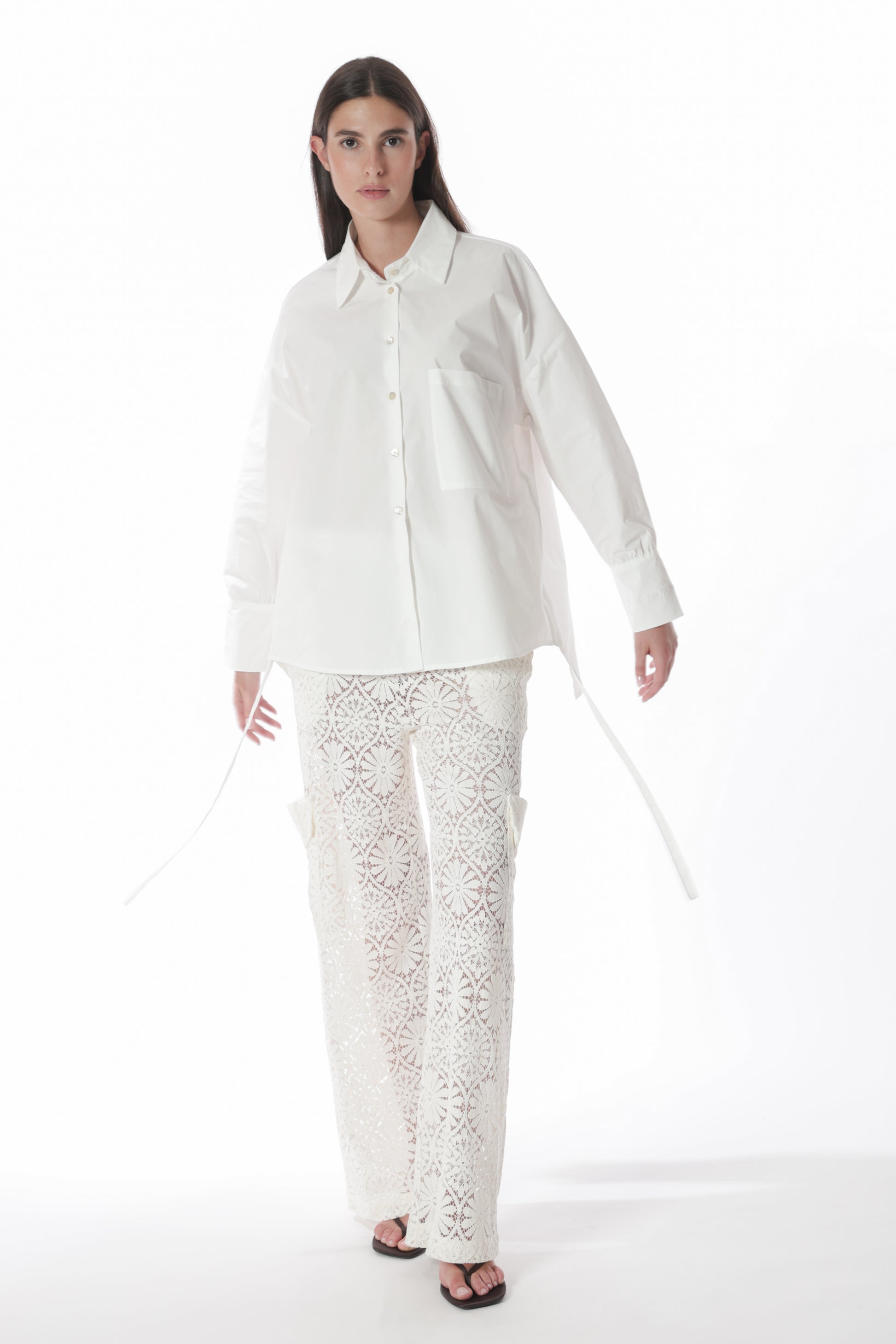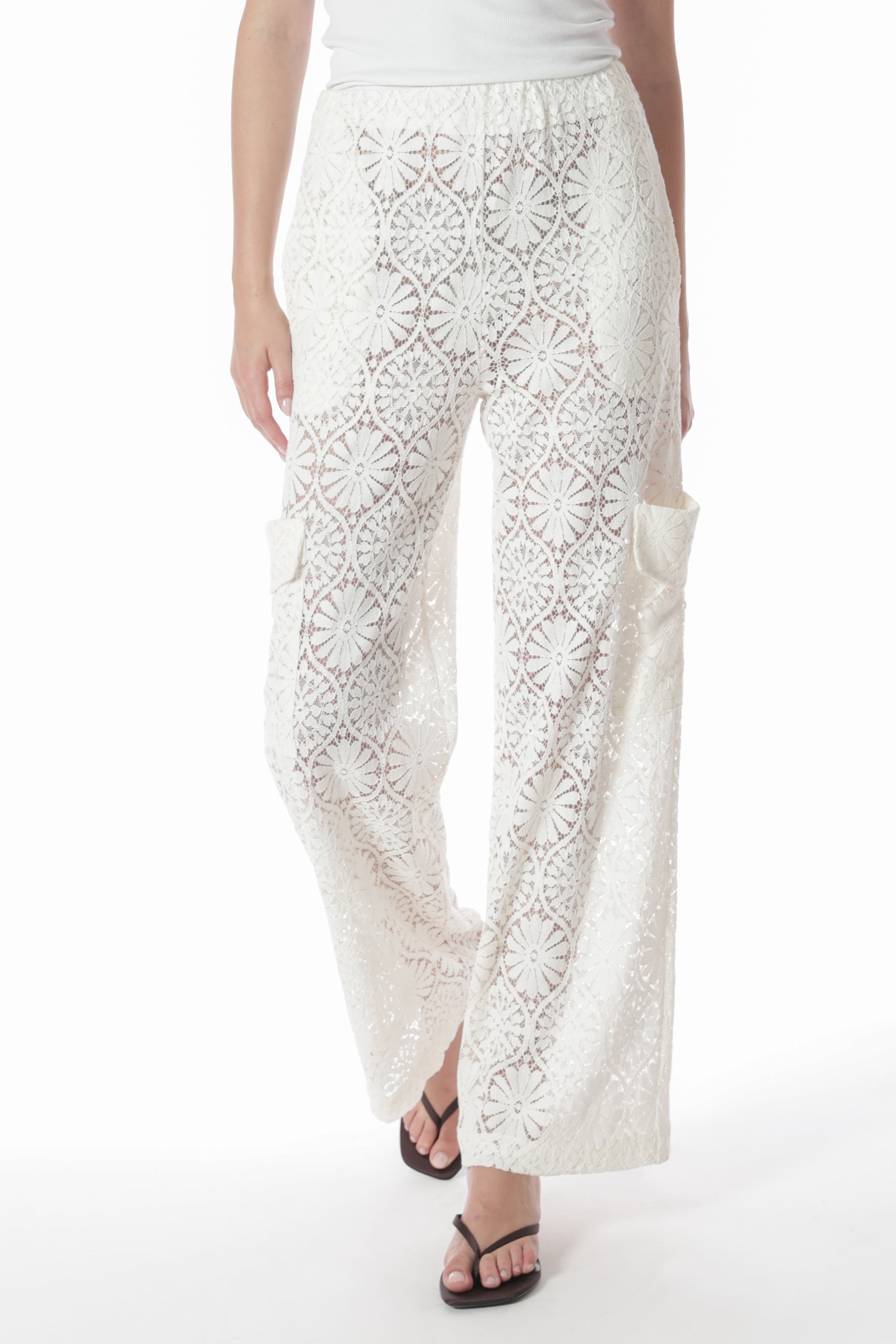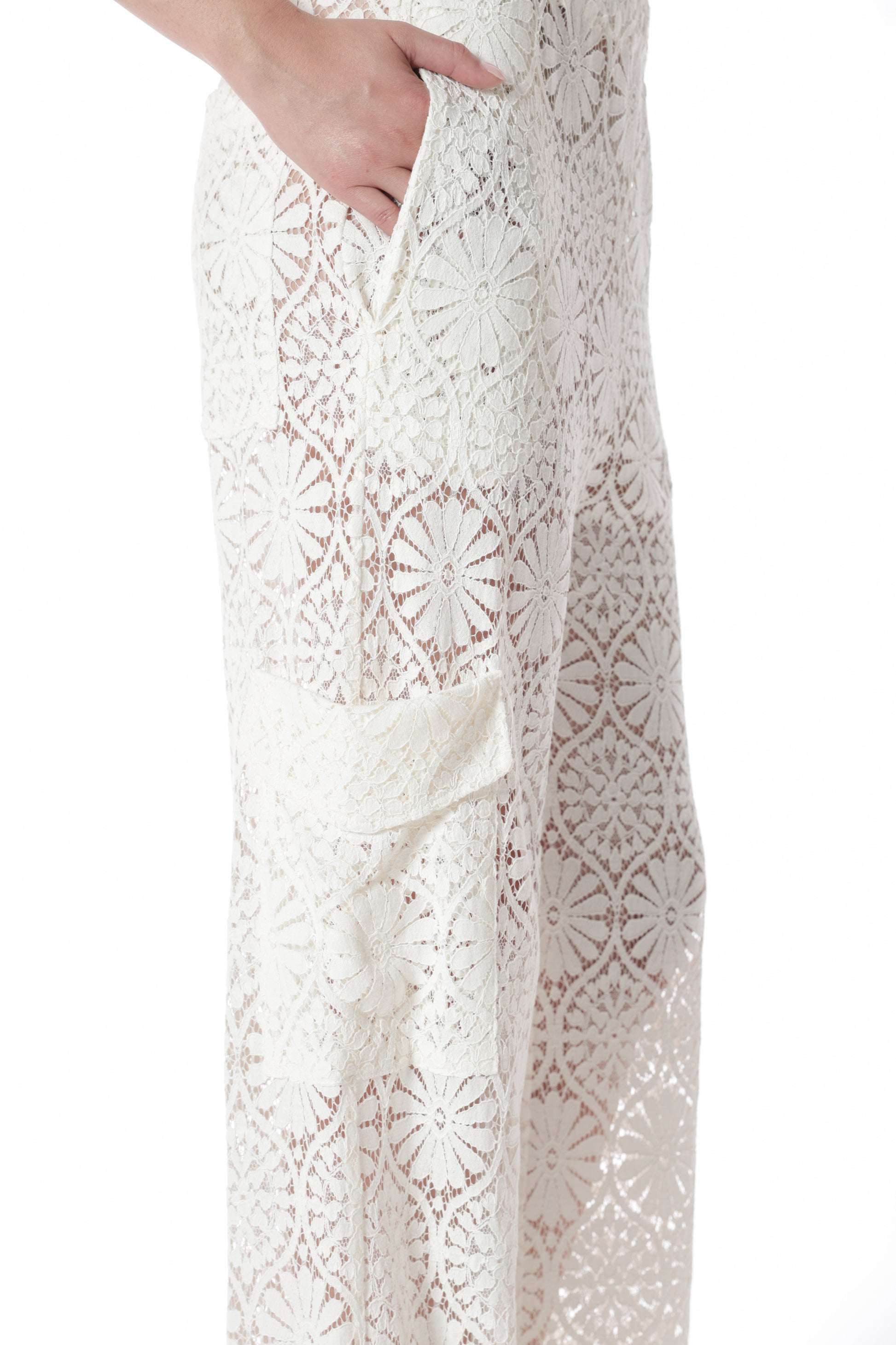 Il pantalone Été è un omaggio alla femminilità rilassata dell’estate. Realizzato in prezioso pizzo macramè burro dal disegno floreale geometrico, è leggero, traforato e pensato per accompagnarti con eleganza nei giorni più caldi.