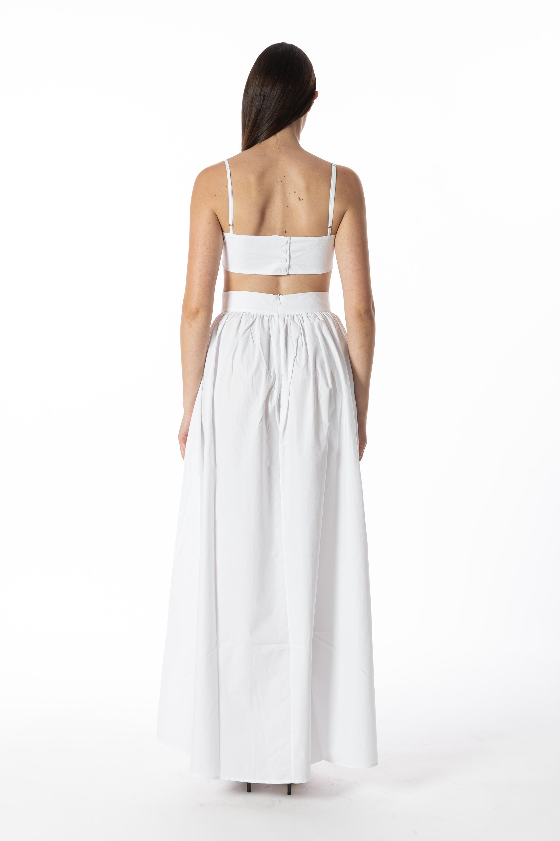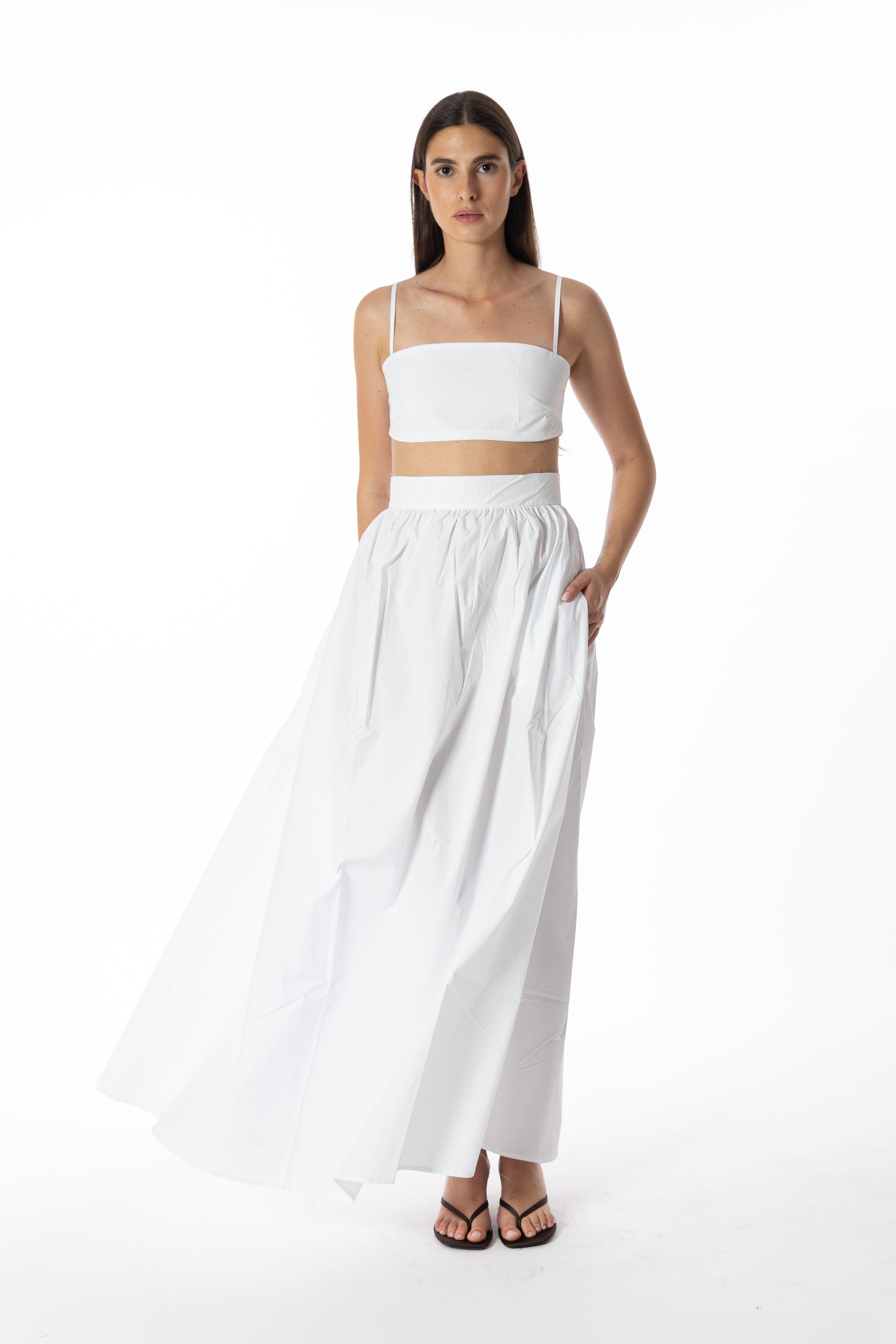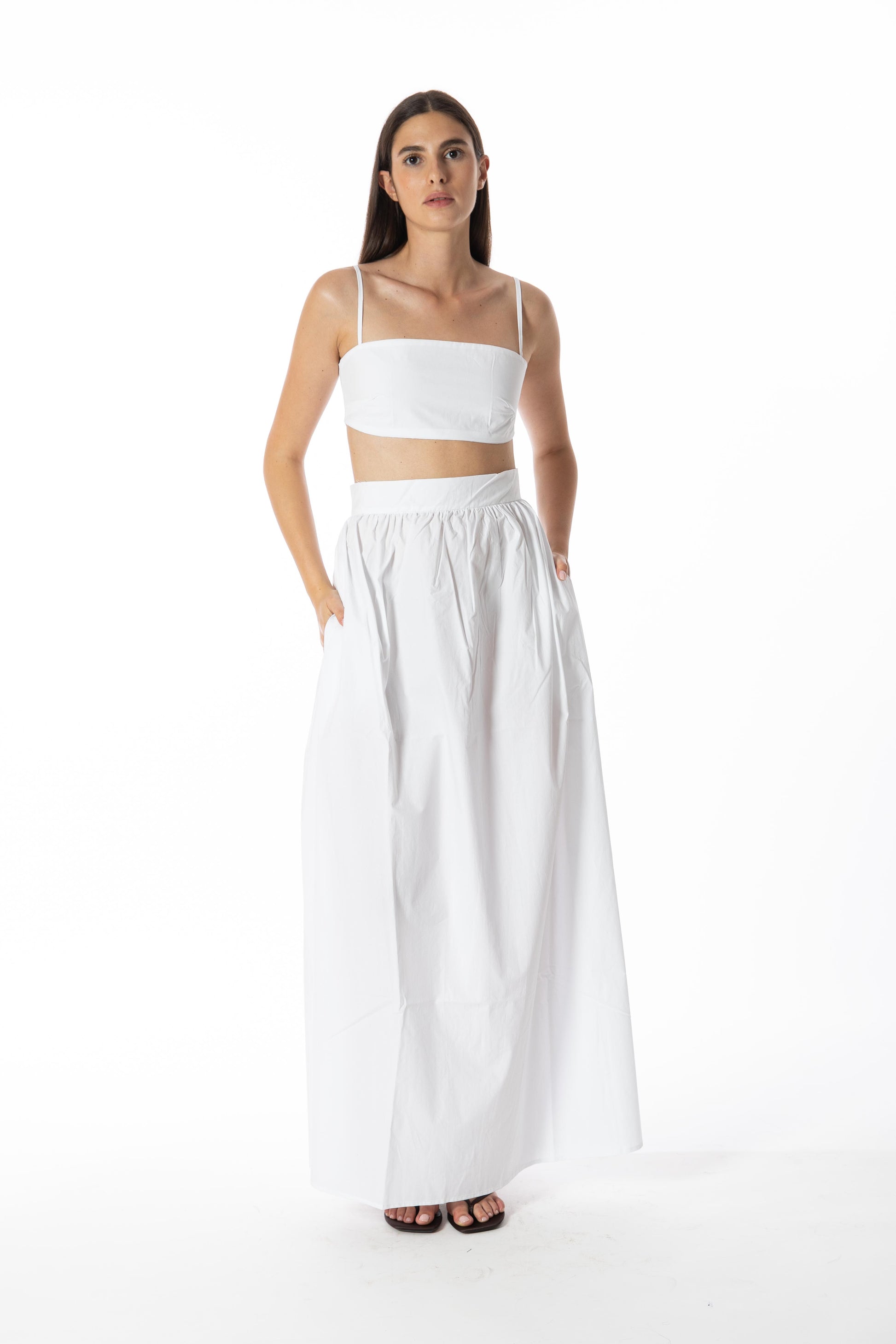 Fresco, essenziale e perfettamente estivo: il coordinato Isla è composto da un top a fascia con spalline sottili regolabili e chiusura con bottoncini ricoperti sul retro, abbinato a una gonna lunga a vita alta arricciata. Realizzato in popeline di cotone bianco, questo set minimal e sofisticato è pensato per accompagnarti dalle giornate assolate alle serate più eleganti con naturalezza e comfort.