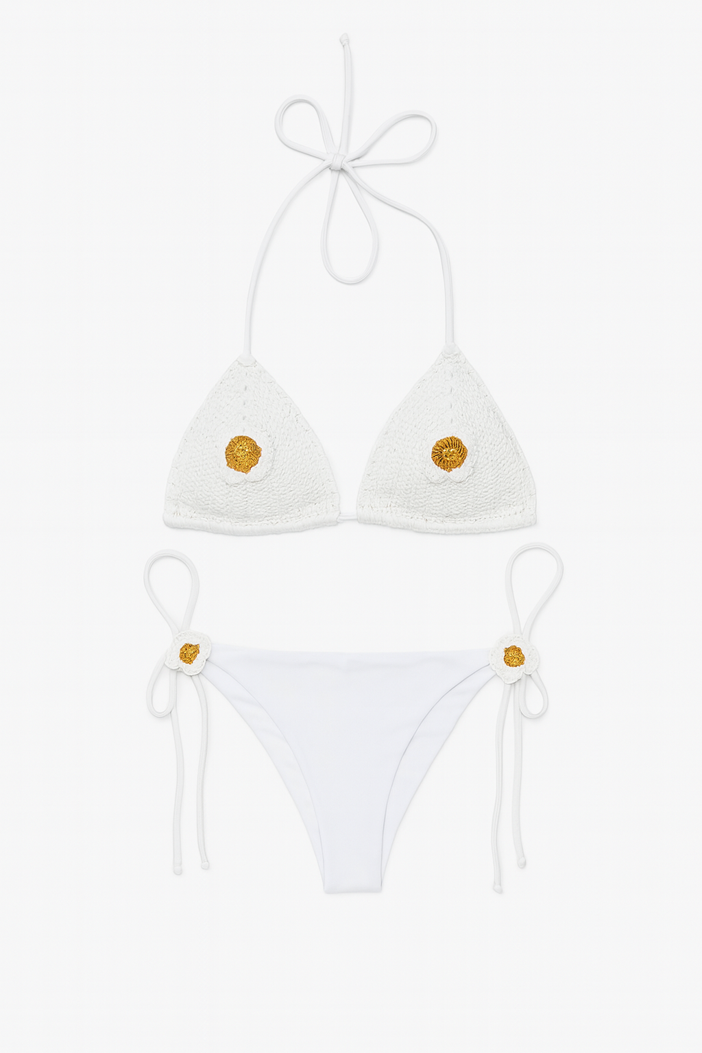 Il bikini Margherita di Martina Ravotti Studio è un inno all’estate italiana: semplice, luminoso e intriso di charme artigianale. Il top a triangolo è realizzato in crochet bianco lavorato a mano, impreziosito da delicati ricami floreali giallo sole che richiamano la bellezza spontanea dei fiori di campo. Lo slip è in tessuto liscio bianco, con laccetti regolabili sui fianchi decorati da rosette in crochet abbinate, per un tocco raffinato e femminile.