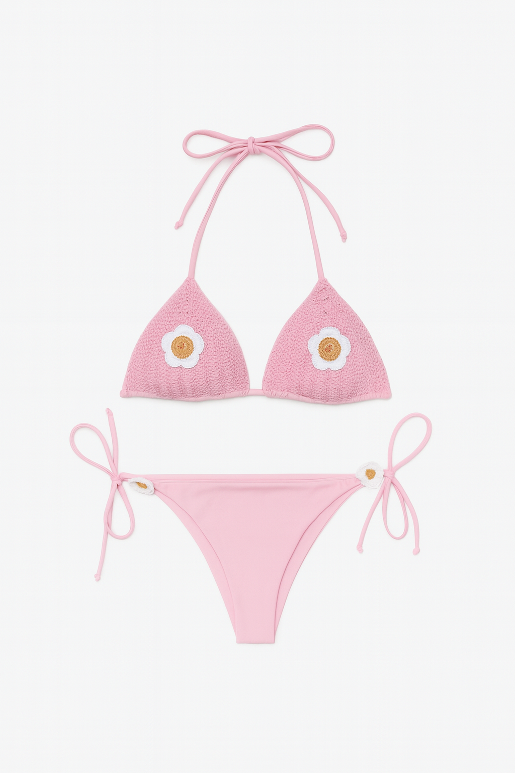 Lo slip rosa in tessuto liscio è semplice e confortevole, arricchito da laccetti regolabili e inserti in crochet coordinati sui fianchi. Il contrasto tra l’estetica baby pink e i dettagli artigianali dona a questo bikini un’allure romantica, fresca e squisitamente estiva.