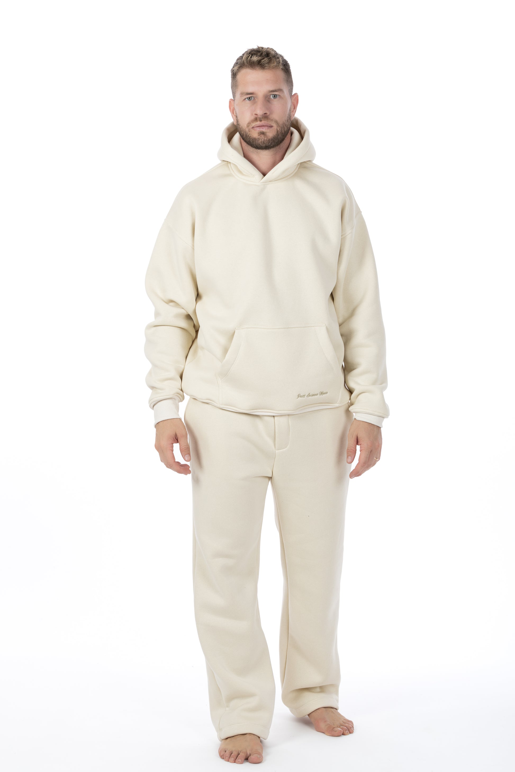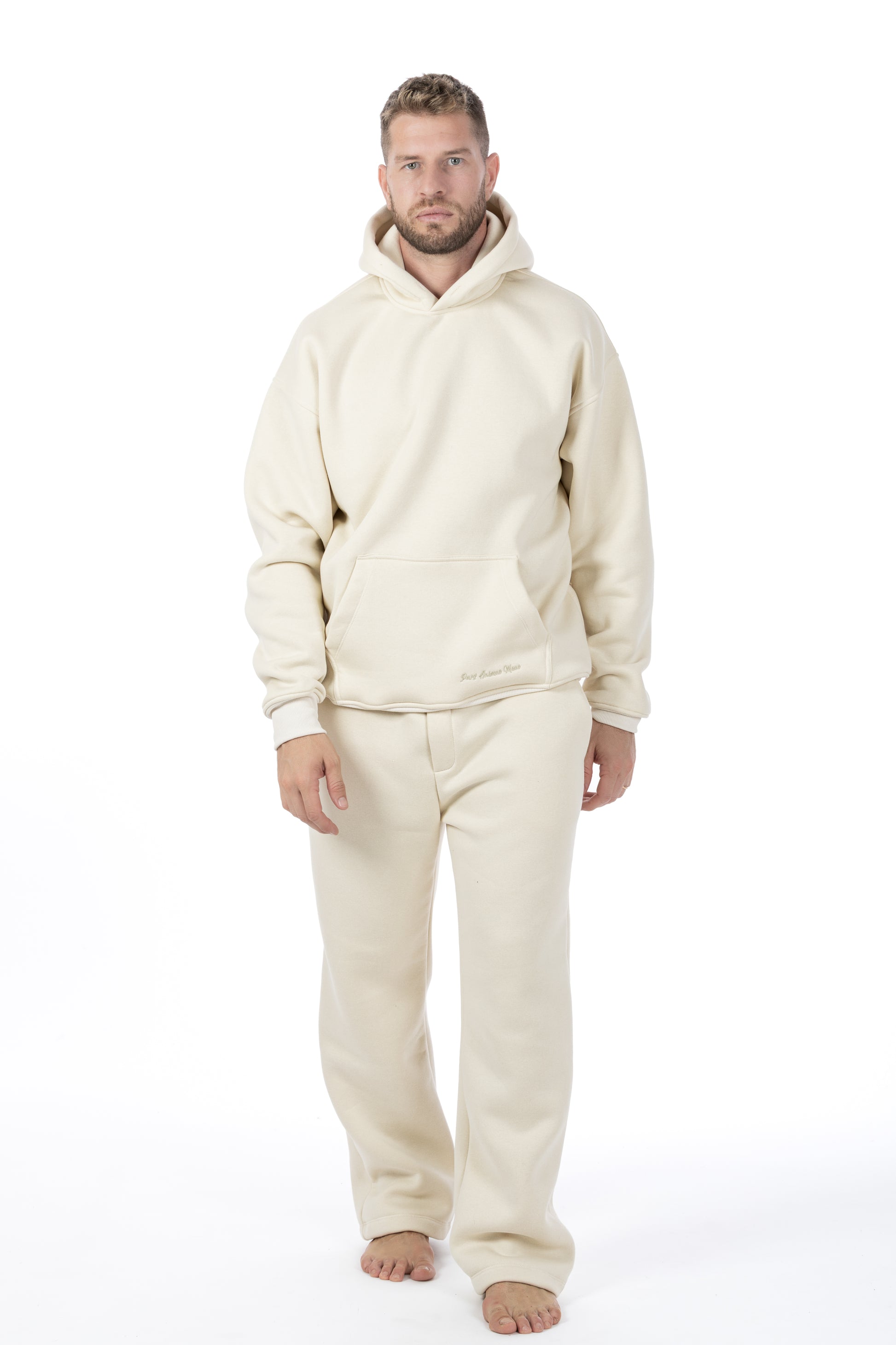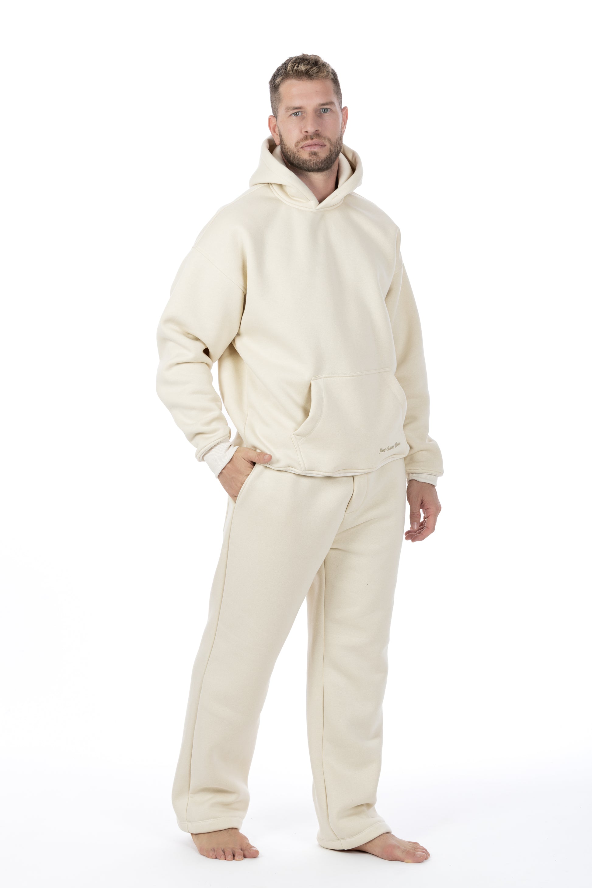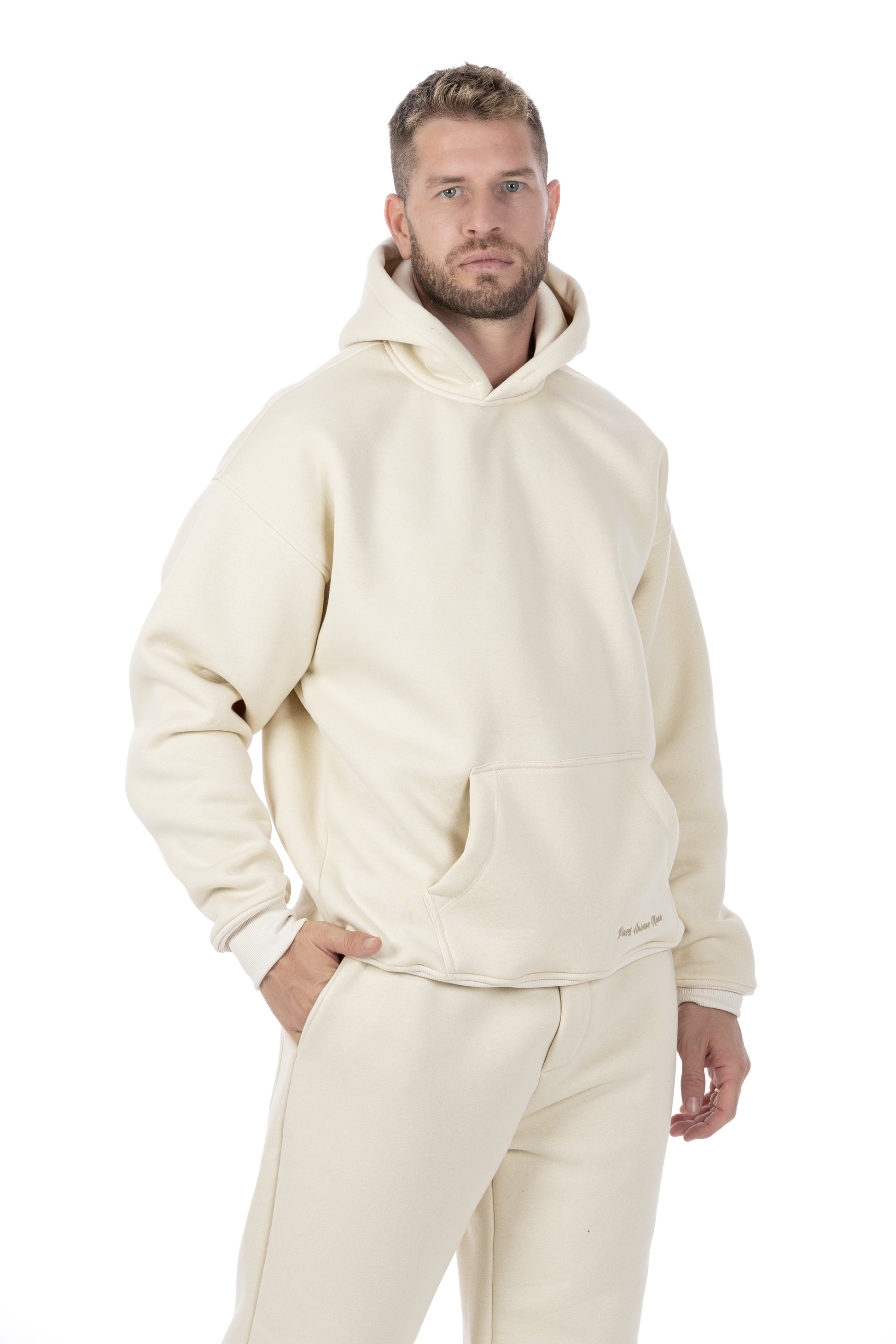 Realizzata in morbido cotone color burro, presenta cappuccio ampio, tasca frontale a marsupio e polsini elasticizzati per una vestibilità comoda e moderna.