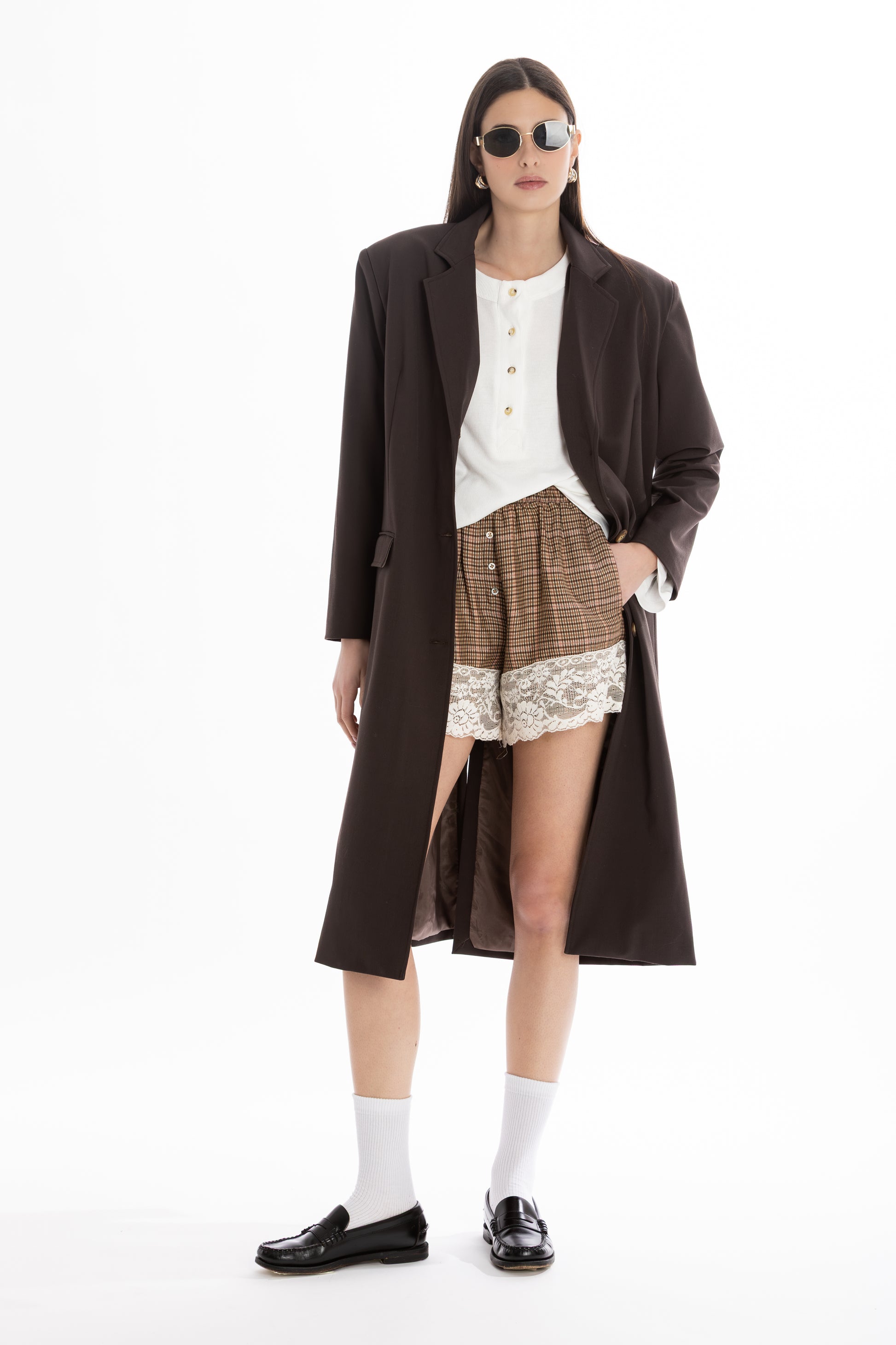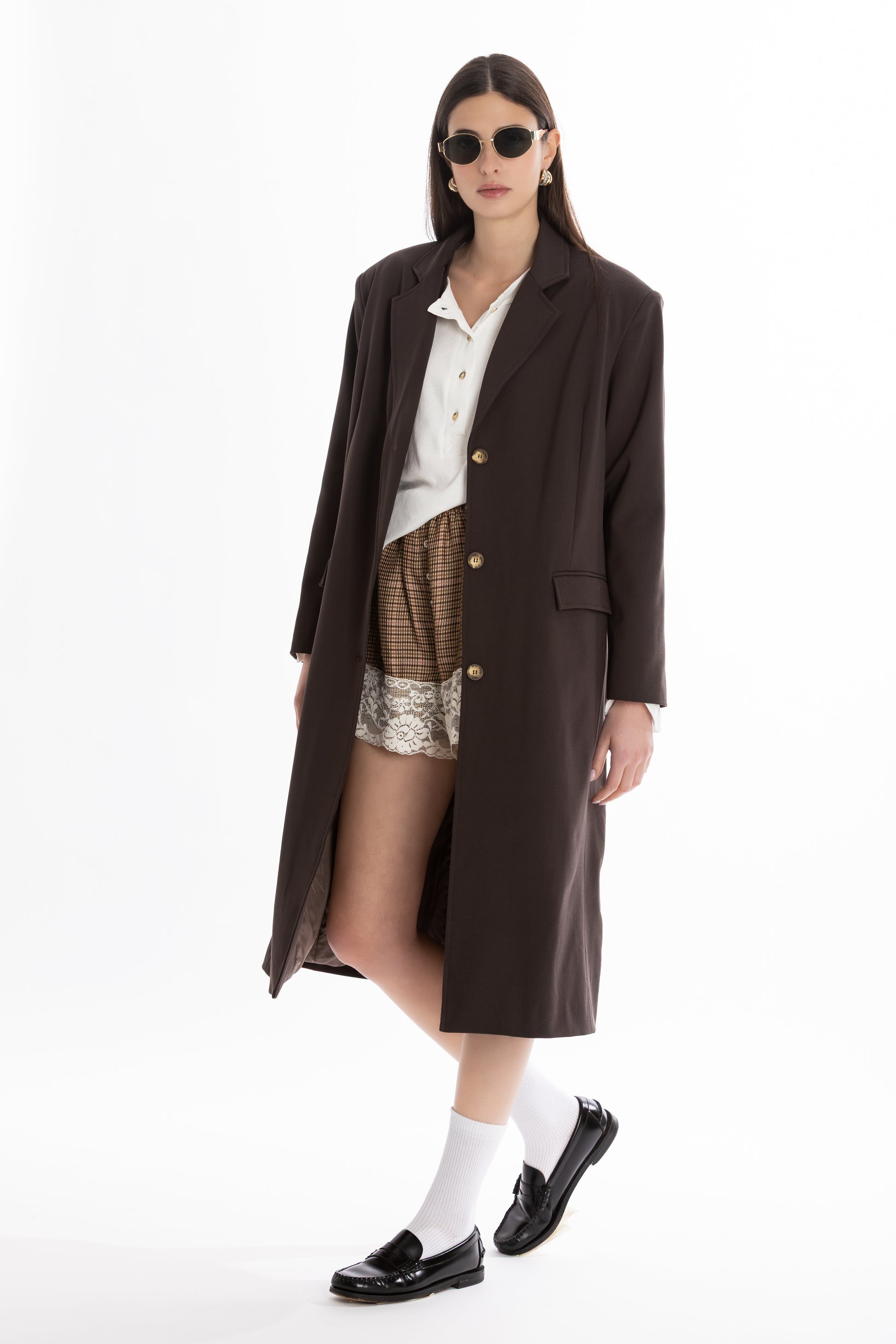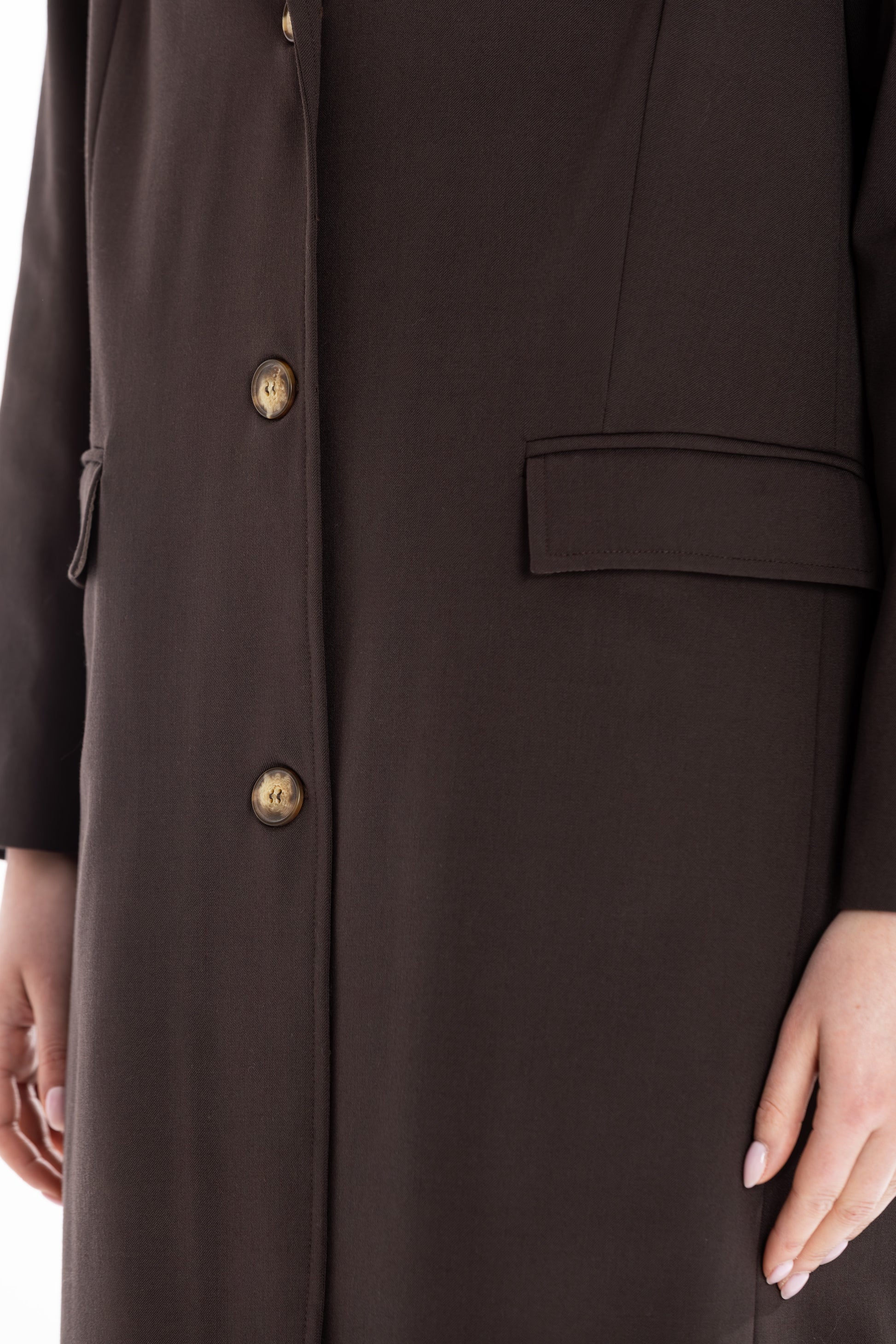 Vittoria è lo spolverino iconico della collezione, proposto nella raffinata tonalità moro, profonda e sofisticata.