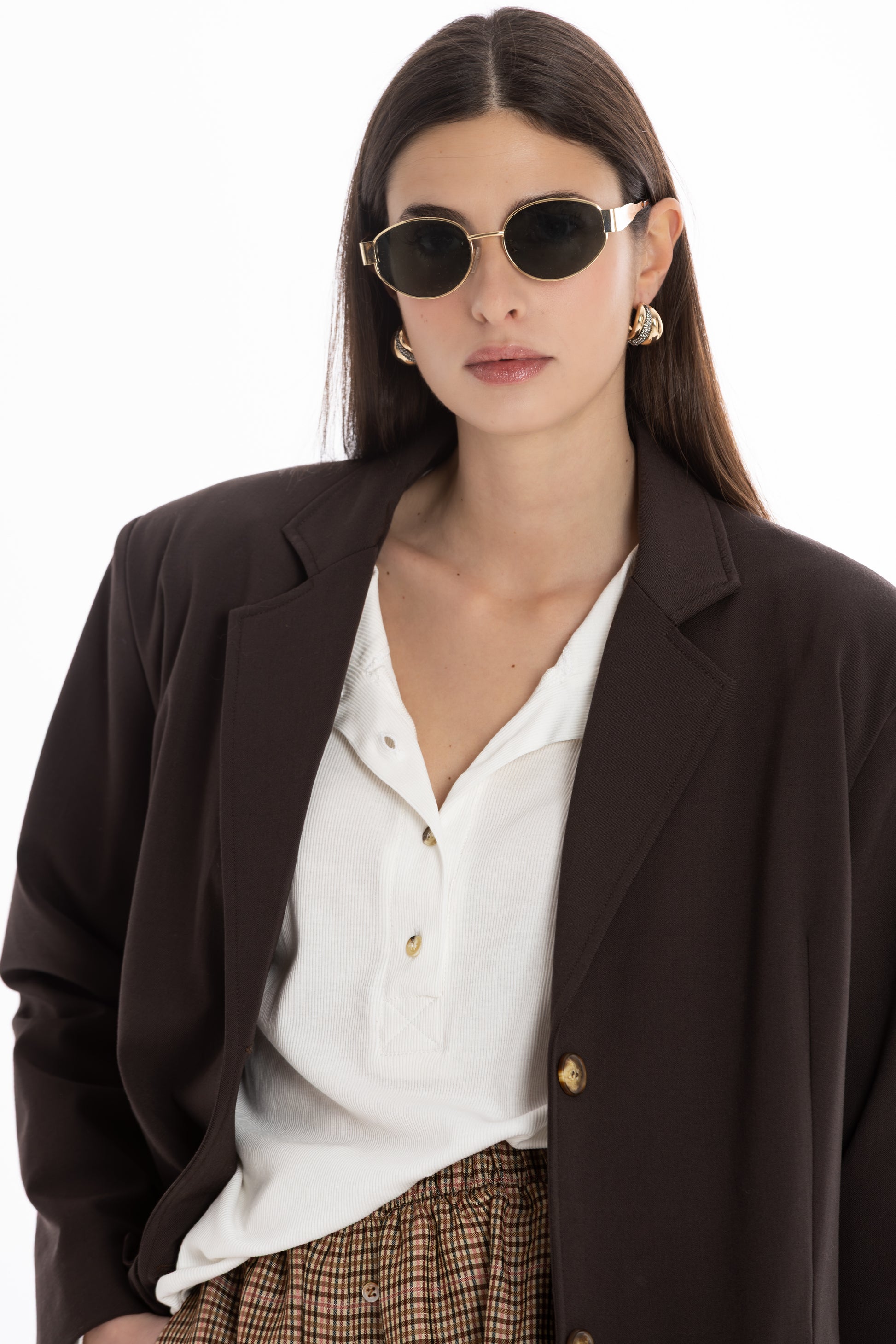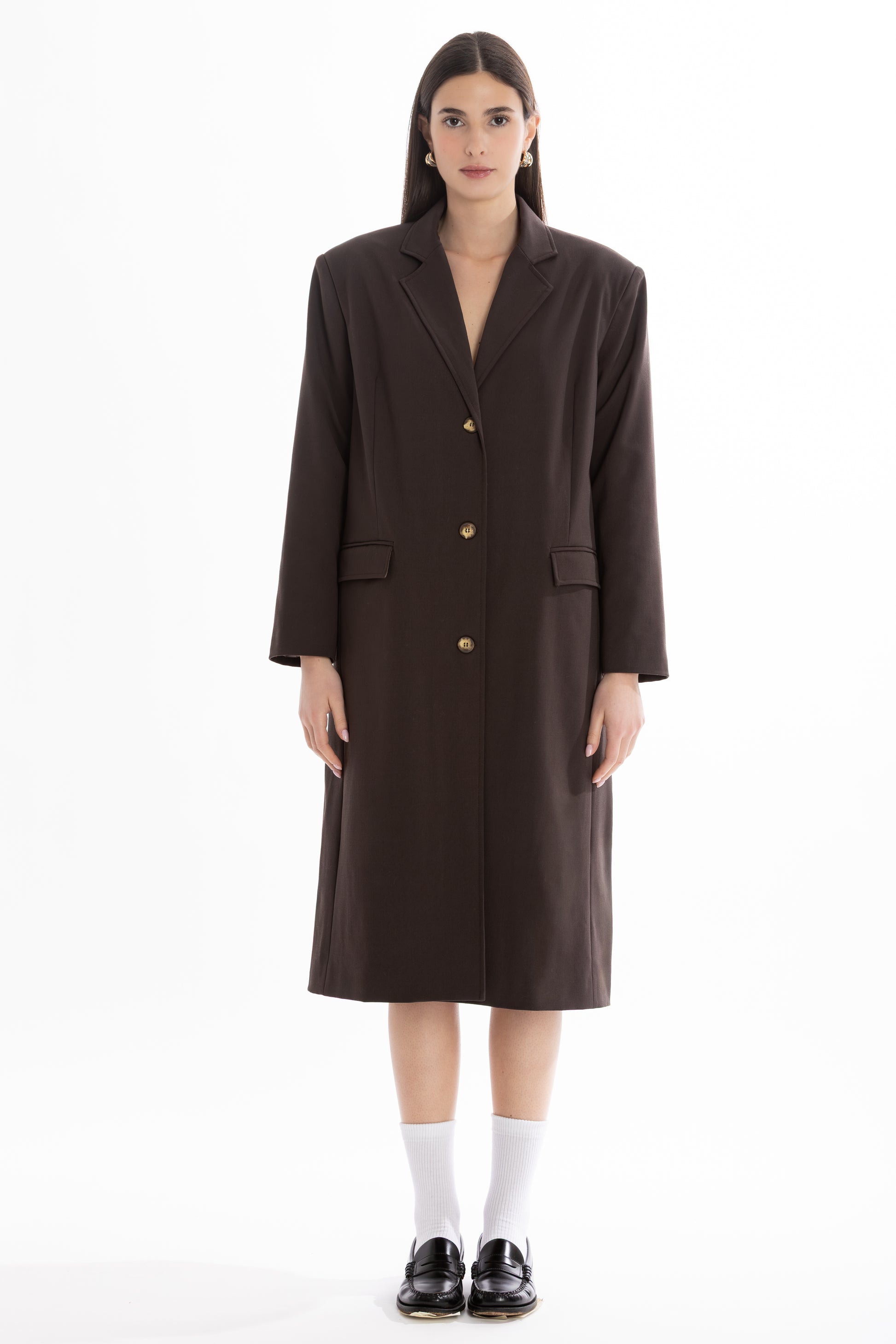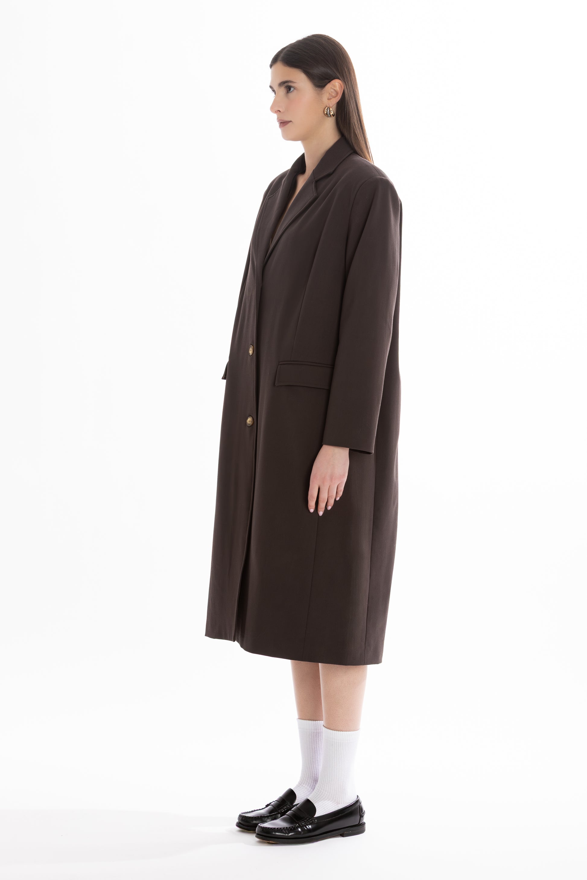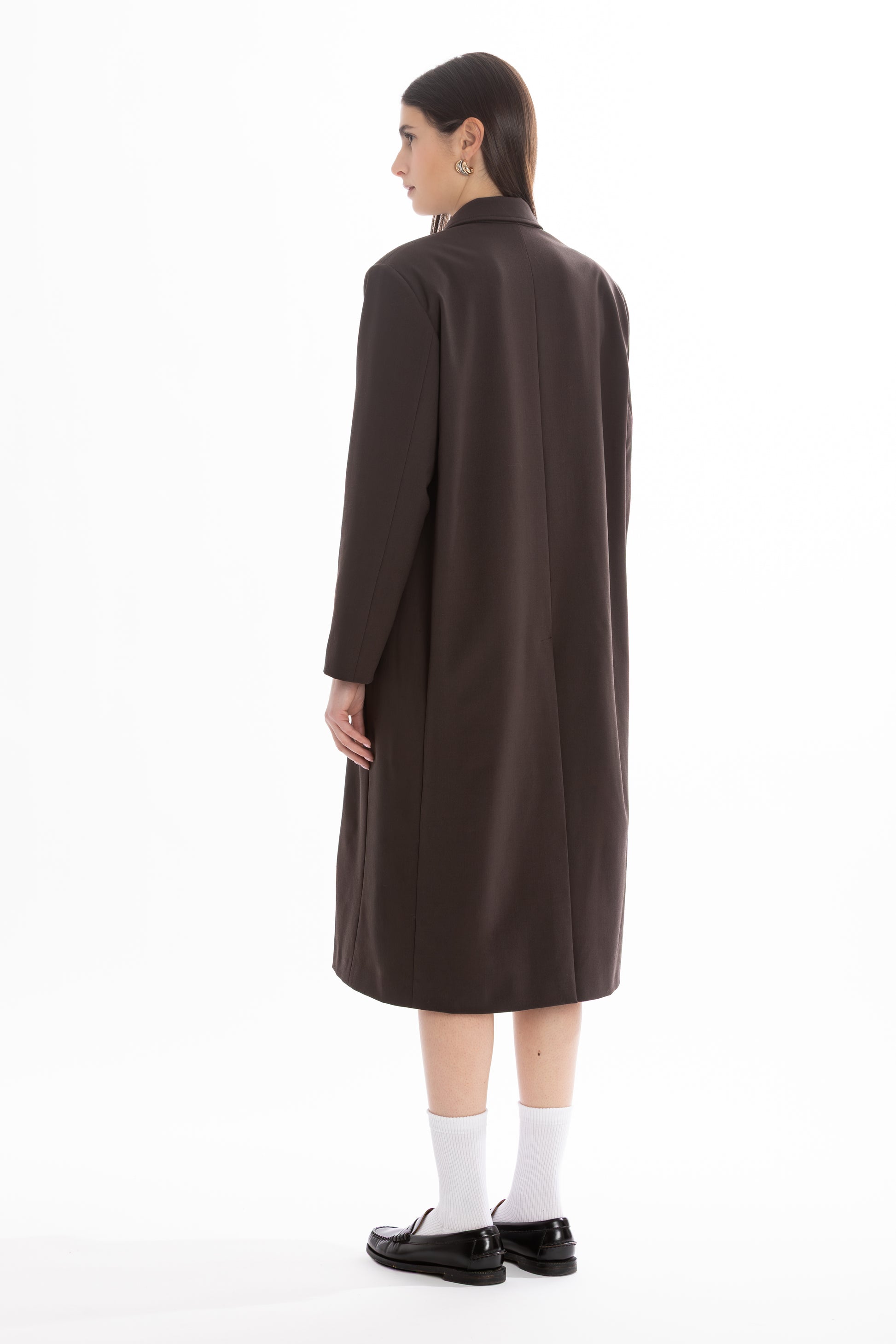 Realizzato in un blend di lana e viscosa, unisce morbidezza e struttura in un equilibrio elegante e contemporaneo. La linea dritta e allungata slancia la silhouette con naturalezza, mentre le spalle definite valorizzano il taglio sartoriale.
