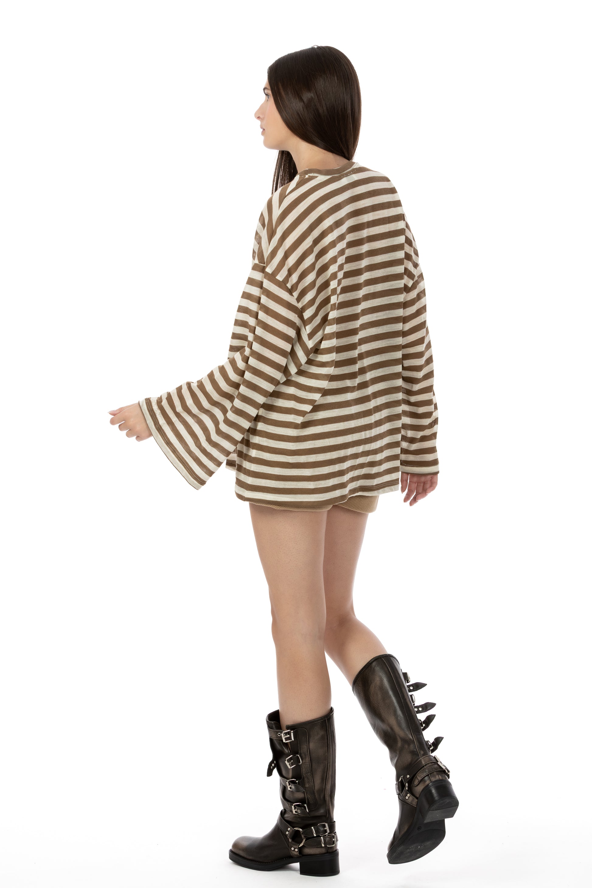 Il taglio oversize e le maniche ampie creano un equilibrio tra stile rilassato e femminilità, mentre il ricamo “Pars Animae Meae” sulla manica sinistra aggiunge un tocco poetico e artigianale.