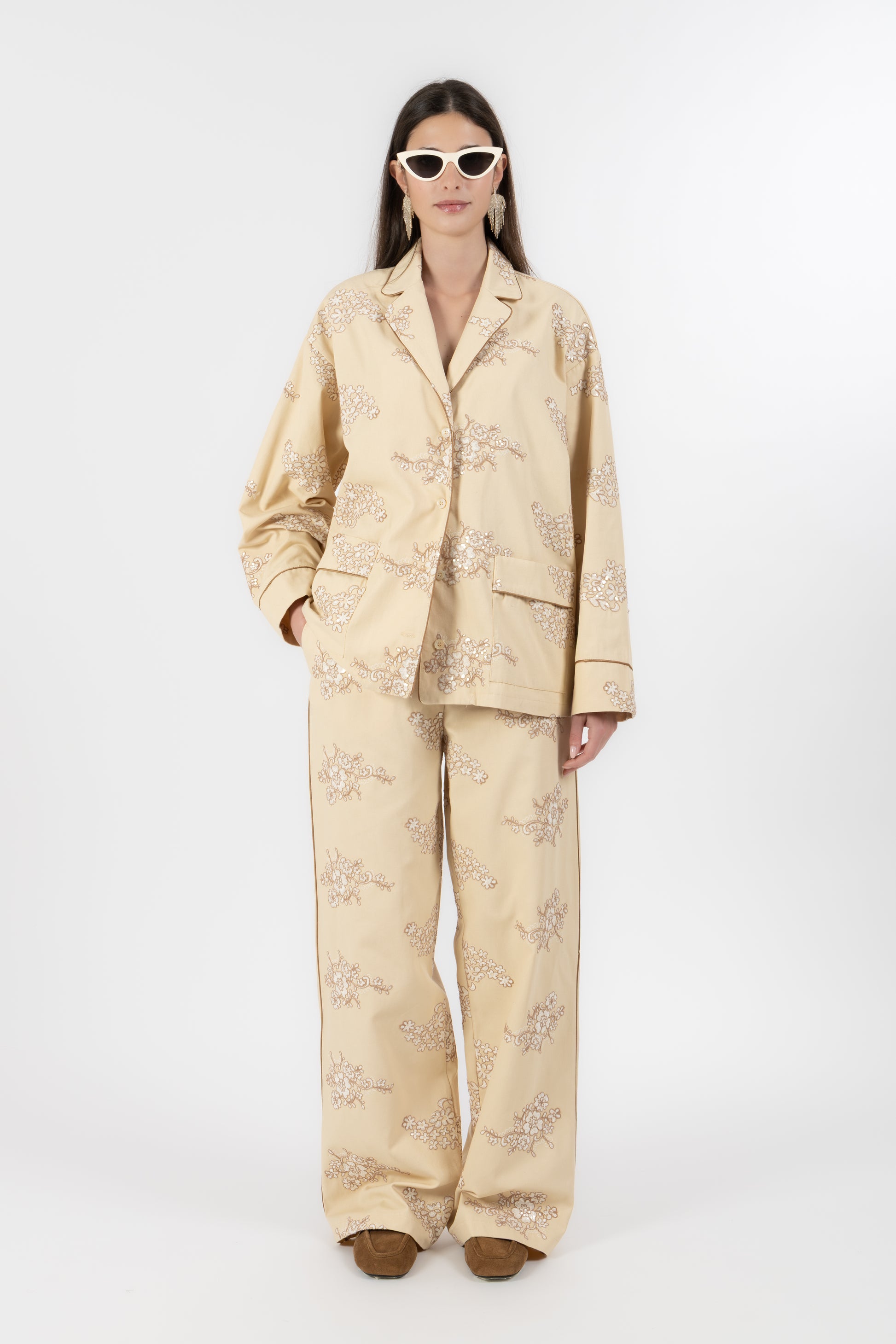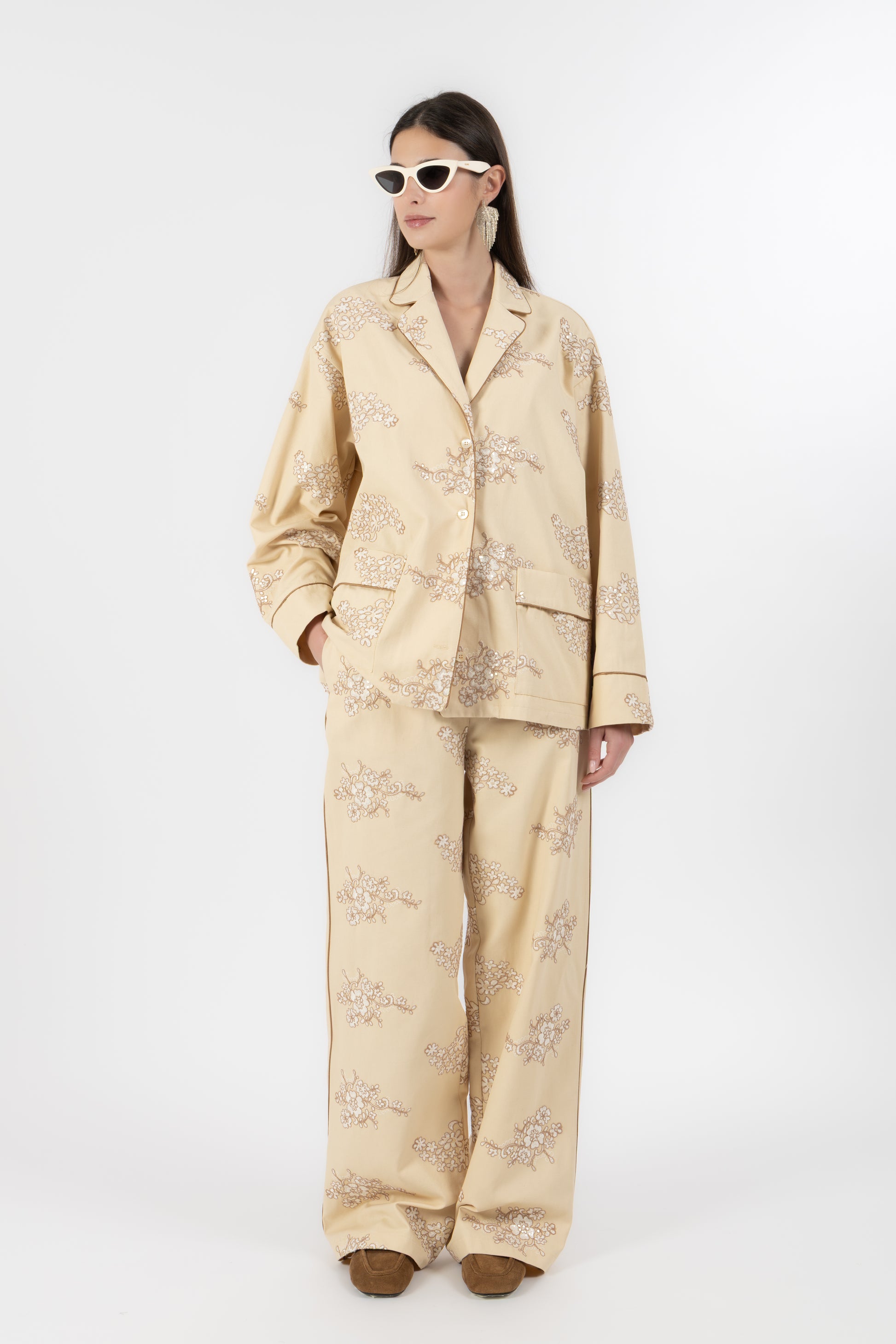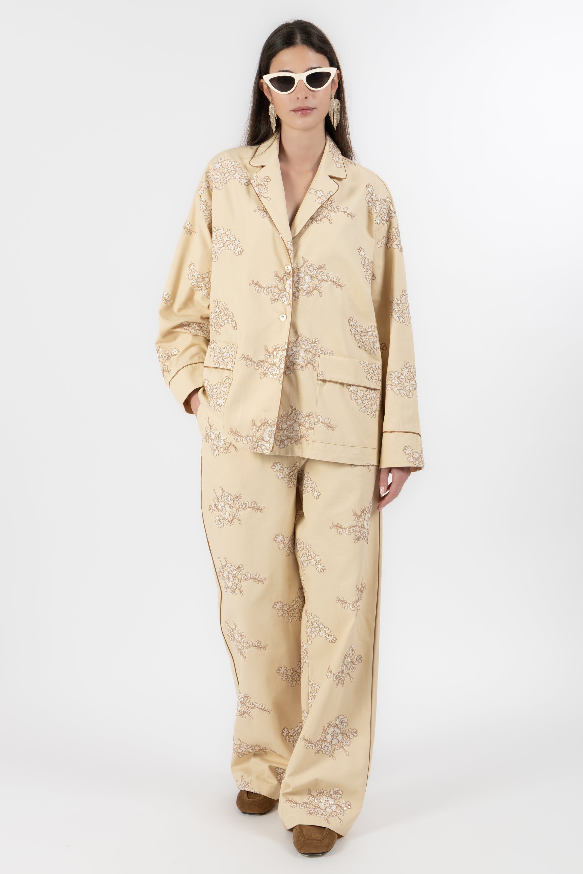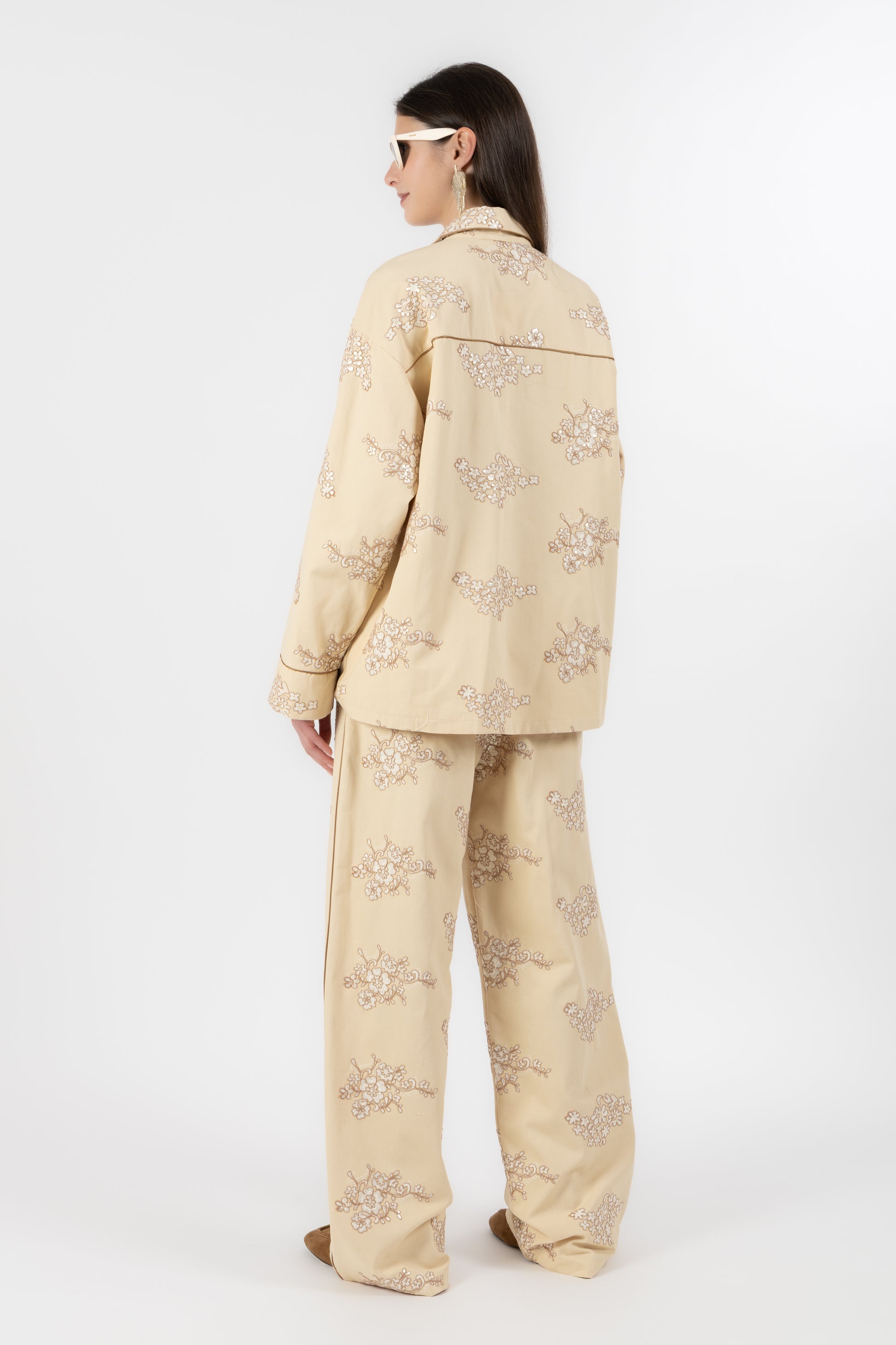Il set è composto da una camicia stile pigiama, bordata a contrasto lungo i profili per seguire il disegno del ricamo e creare un raffinato gioco di linee. I bottoni in madreperla aggiungono un dettaglio prezioso e naturale, mentre le tasche applicate mantengono l’equilibrio tra eleganza e funzionalità.