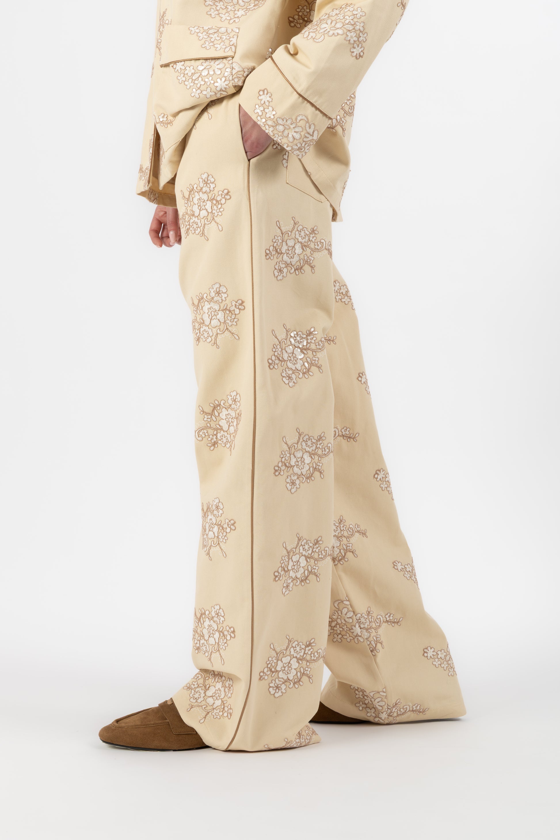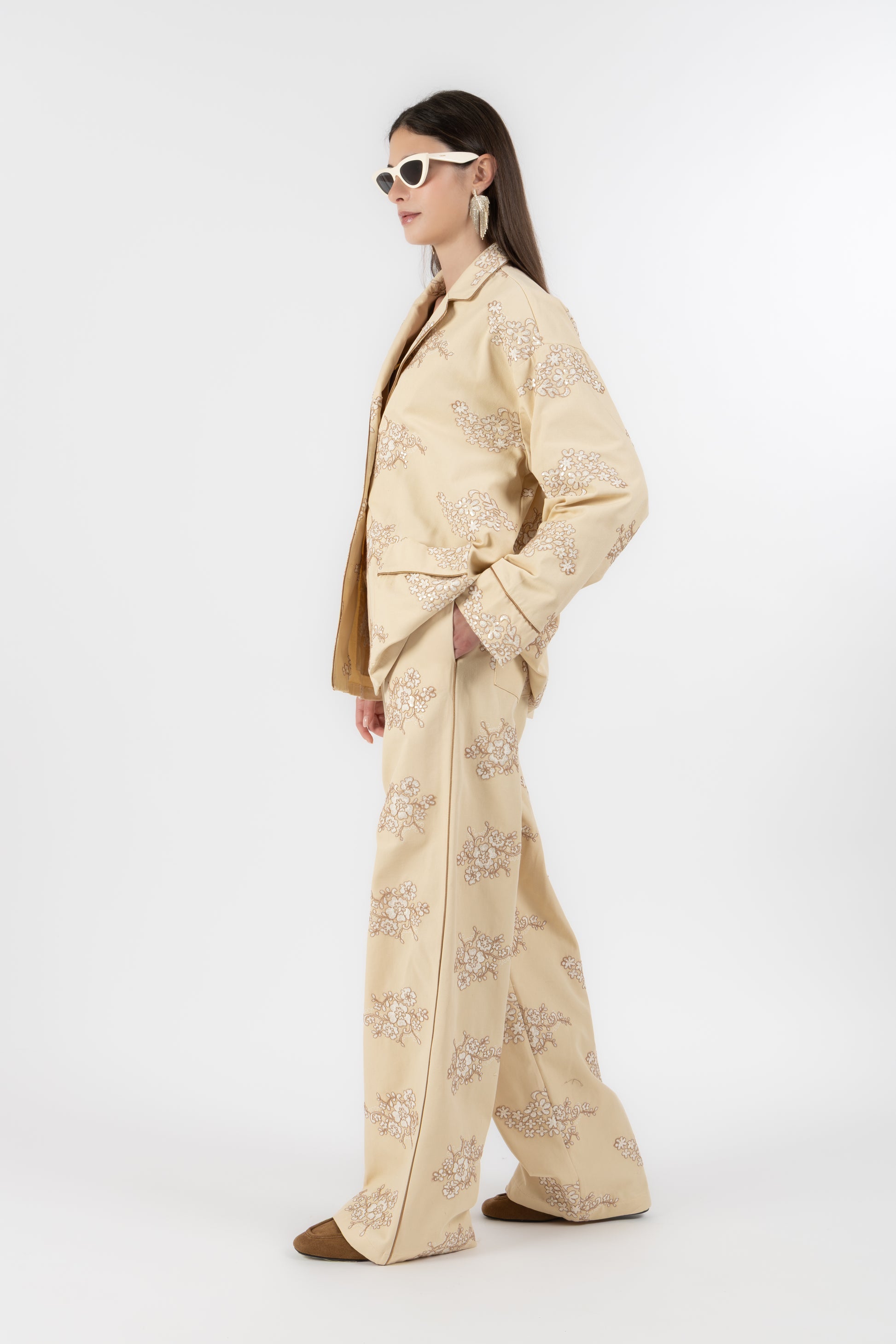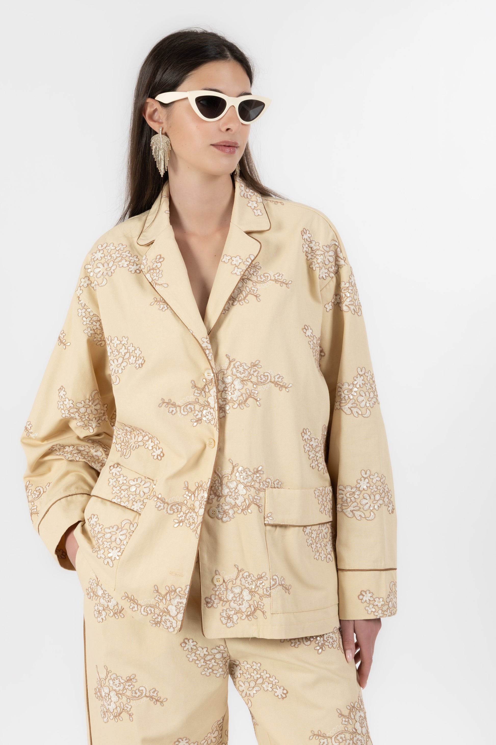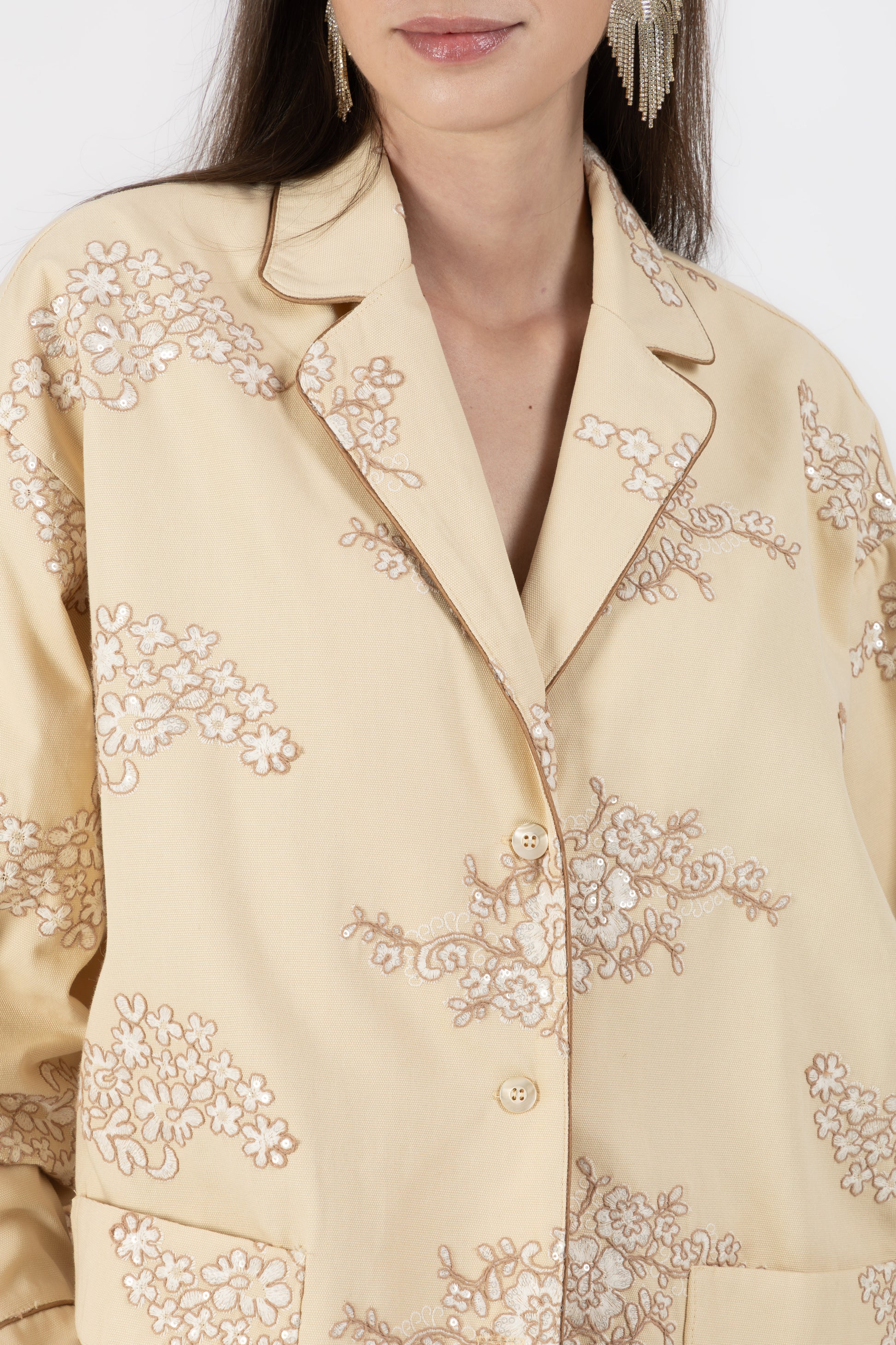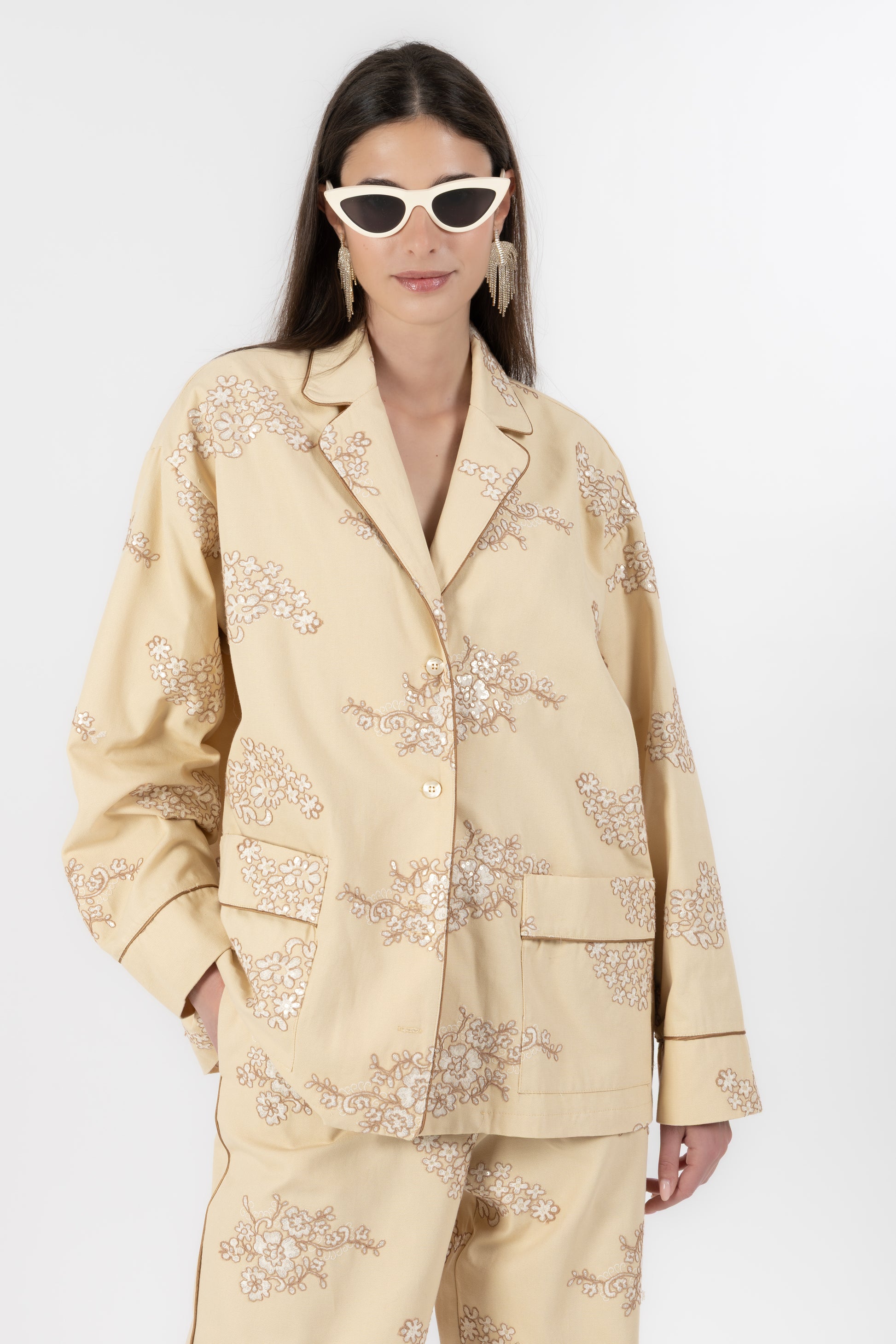 Il set è composto da una camicia stile pigiama, bordata a contrasto lungo i profili per seguire il disegno del ricamo e creare un raffinato gioco di linee. I bottoni in madreperla aggiungono un dettaglio prezioso e naturale, mentre le tasche applicate mantengono l’equilibrio tra eleganza e funzionalità.