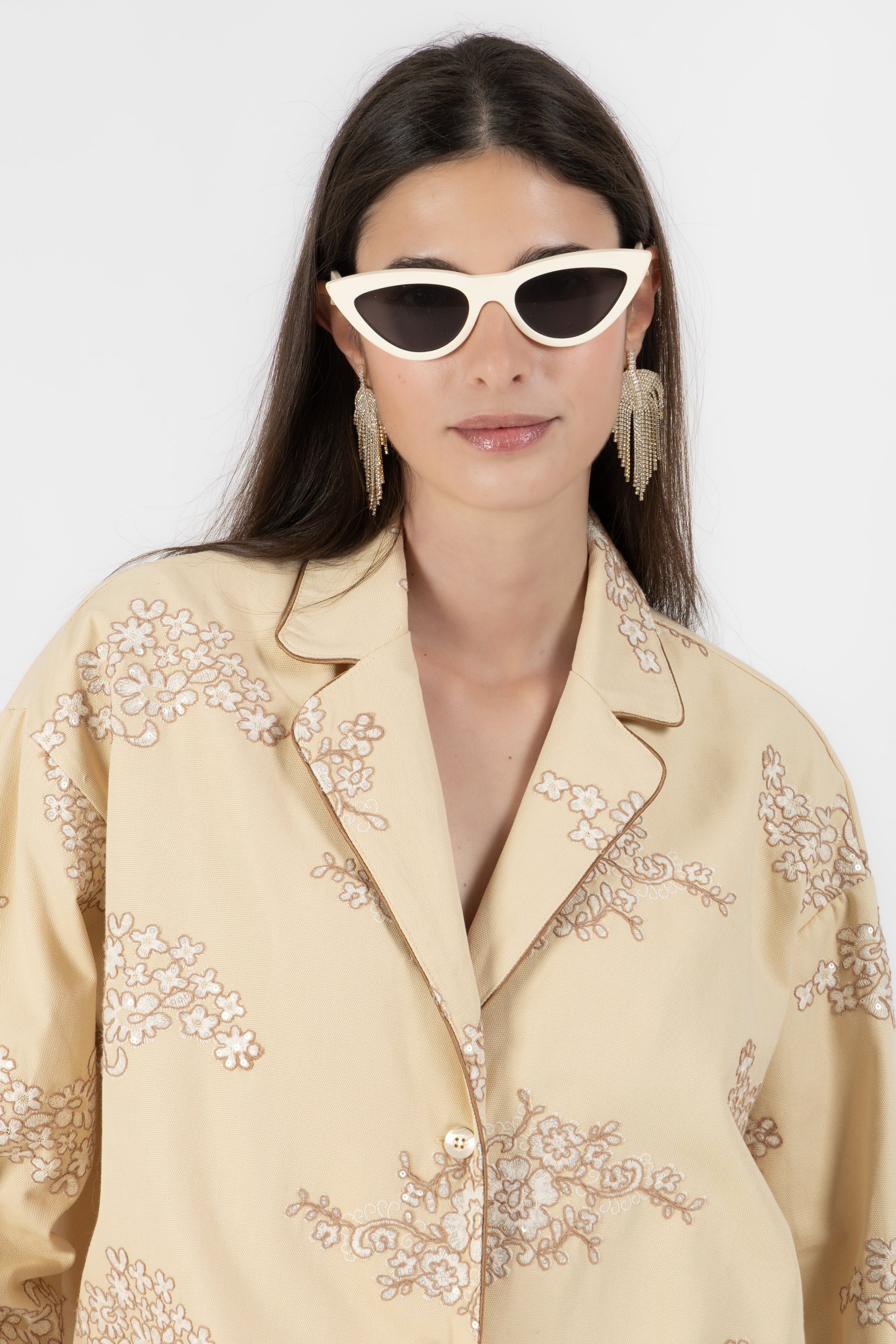Alix è il coordinato più luminoso della collezione SS26. Realizzato in 100% cotone nella delicata tonalità burro, è impreziosito da ricami floreali arricchiti da micropaillettes trasparenti che catturano la luce con discrezione.