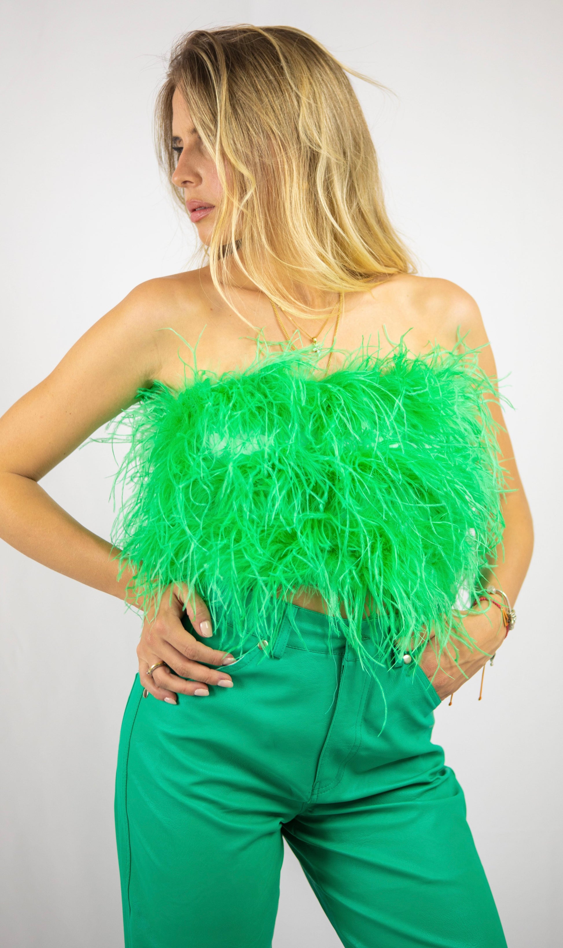 Il top è interamente realizzato con vere piume di struzzo, applicate a mano una ad una, per creare volume, movimento e un effetto visivo straordinario.