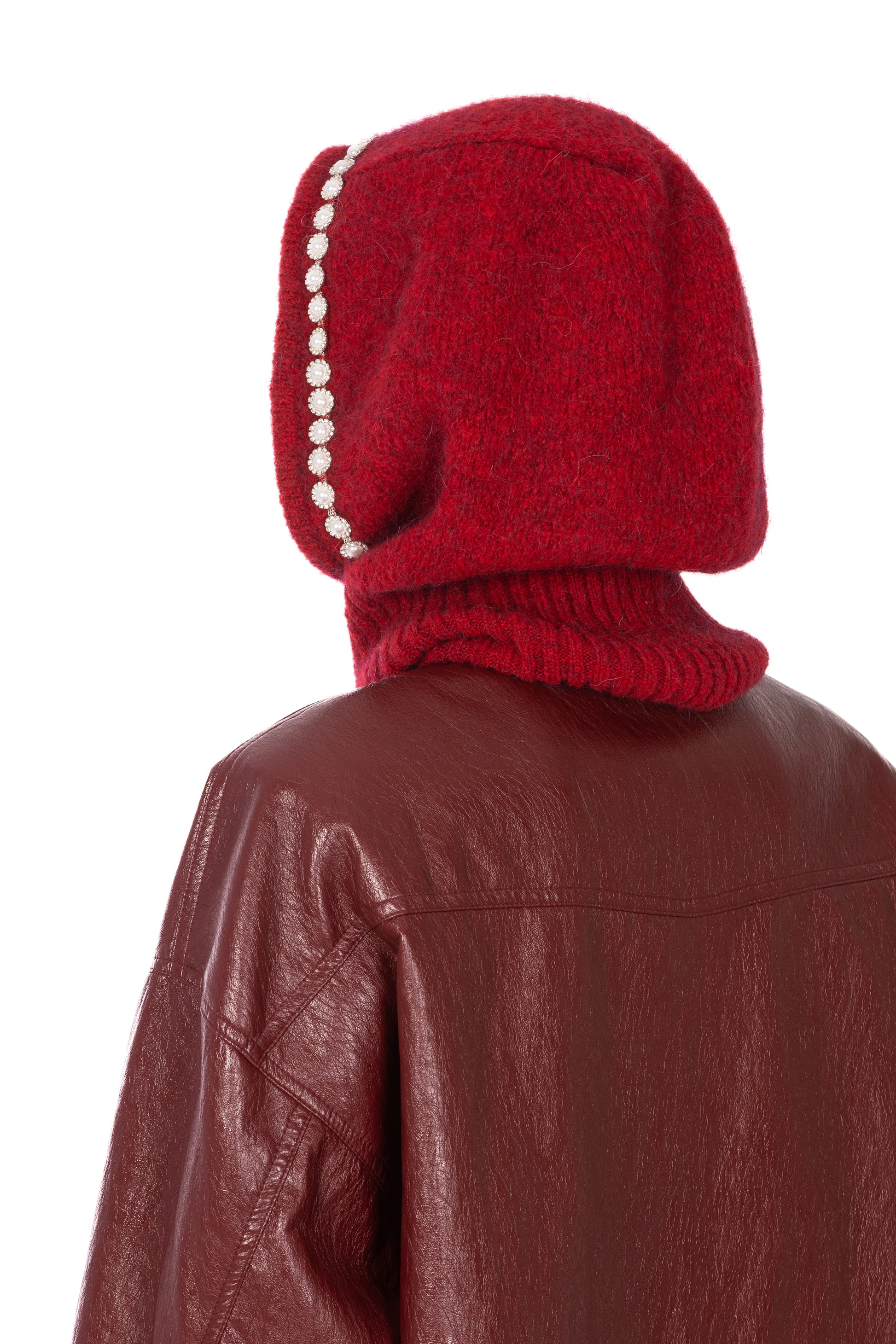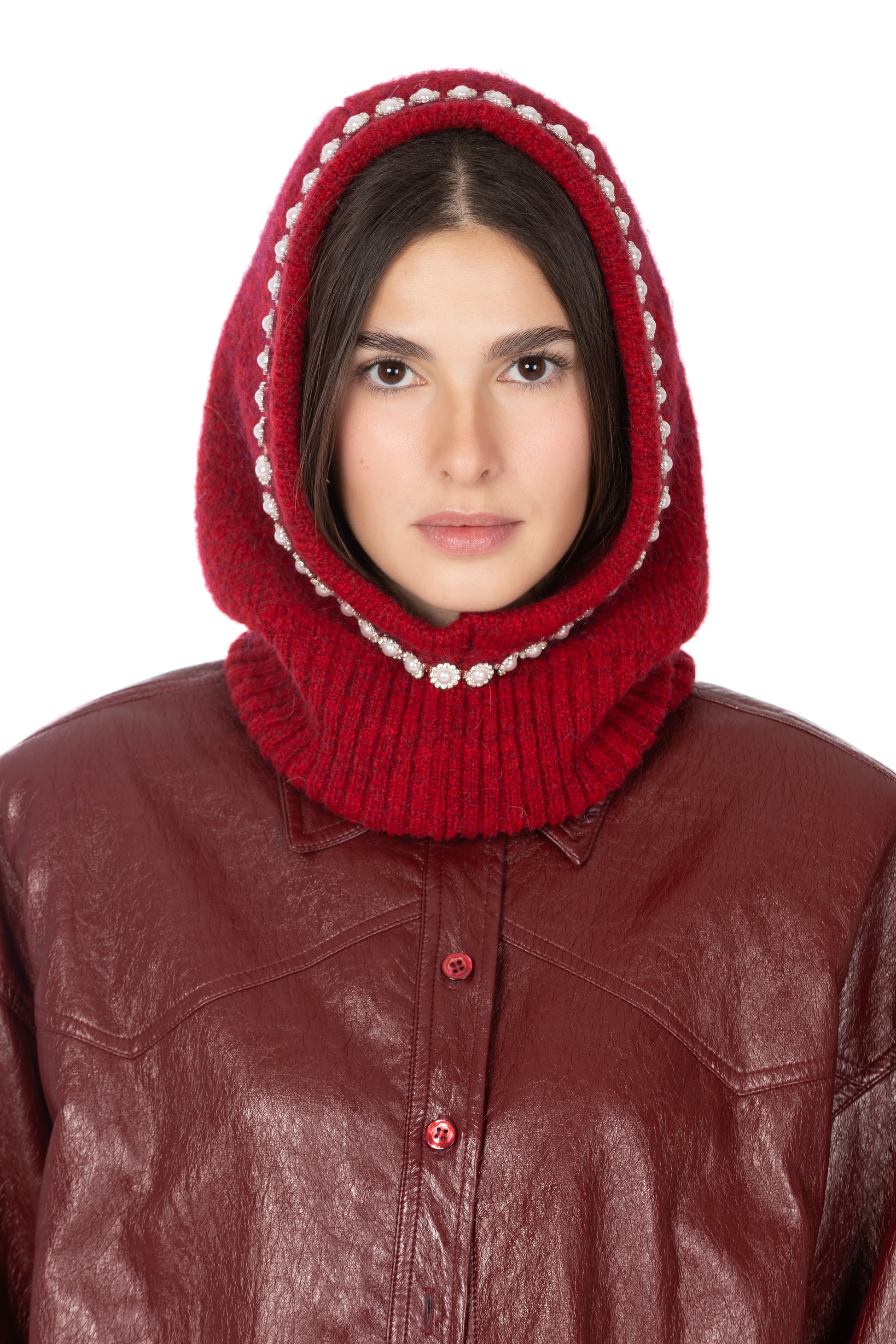 Balaclava in maglia bordeaux con applicazione gioiello di perle e strass. Morbido, caldo, avvolgente, perfetto per completare i look invernali con un tocco luminoso.