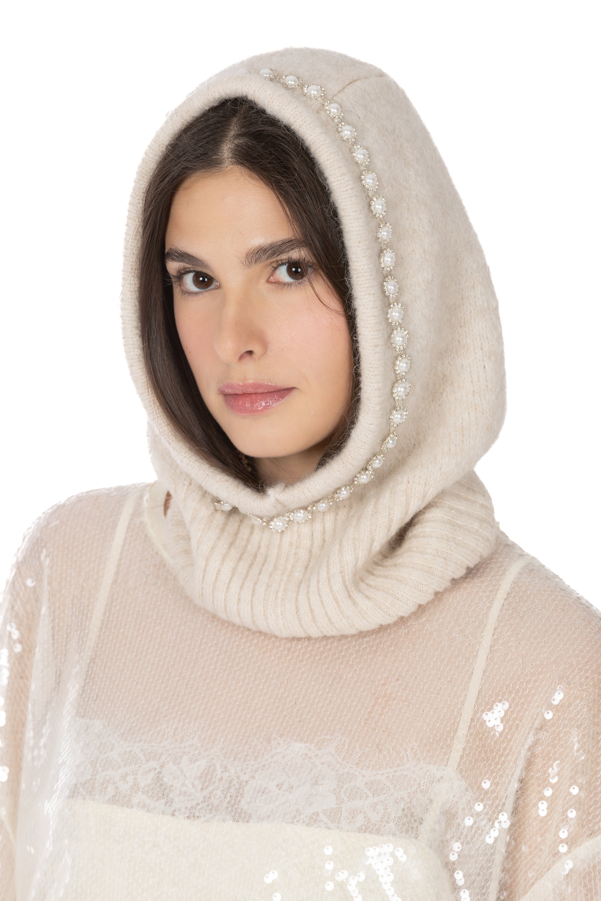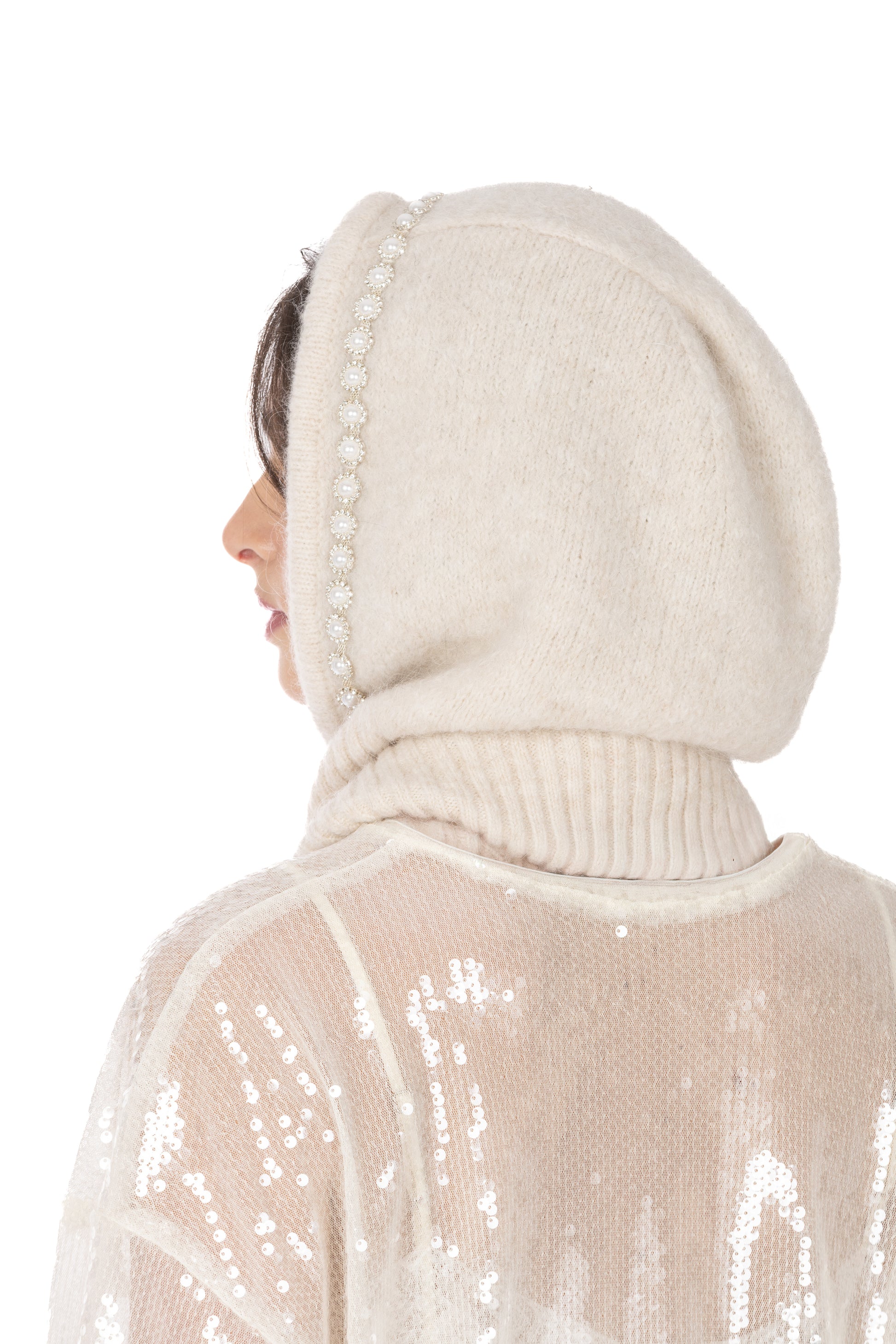 Balaclava in maglia panna con applicazione gioiello di perle e strass. Morbido, caldo, avvolgente, perfetto per completare i look invernali con un tocco luminoso.